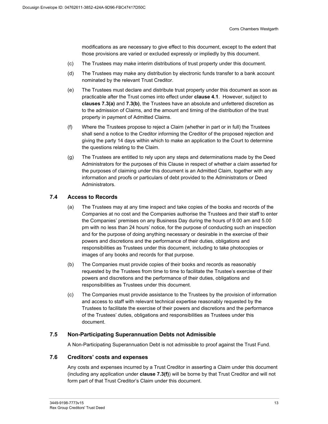 Corrs Chambers Westgarth 3449-9198-7773v15 13 Rex Group Creditors' Trust Deed modifications as are necessary to give effect to this document, except to the extent that those provisions are varied or excluded expressly or impliedly by this document. (c) The Trustees may make interim distributions of trust property under this document. (d) The Trustees may make any distribution by electronic funds transfer to a bank account nominated by the relevant Trust Creditor. (e) The Trustees must declare and distribute trust property under this document as soon as practicable after the Trust comes into effect under clause 4.1. However, subject to clauses 7.3(a) and 7.3(b), the Trustees have an absolute and unfettered discretion as to the admission of Claims, and the amount and timing of the distribution of the trust property in payment of Admitted Claims. (f) Where the Trustees propose to reject a Claim (whether in part or in full) the Trustees shall send a notice to the Creditor informing the Creditor of the proposed rejection and giving the party 14 days within which to make an application to the Court to determine the questions relating to the Claim. (g) The Trustees are entitled to rely upon any steps and determinations made by the Deed Administrators for the purposes of this Clause in respect of whether a claim asserted for the purposes of claiming under this document is an Admitted Claim, together with any information and proofs or particulars of debt provided to the Administrators or Deed Administrators. 7.4 Access to Records (a) The Trustees may at any time inspect and take copies of the books and records of the Companies at no cost and the Companies authorise the Trustees and their staff to enter the Companies’ premises on any Business Day during the hours of 9.00 am and 5.00 pm with no less than 24 hours’ notice, for the purpose of conducting such an inspection and for the purpose of doing anything necessary or desirable in the exercise of their powers and discretions and the performance of their duties, obligations and responsibilities as Trustees under this document, including to take photocopies or images of any books and records for that purpose. (b) The Companies must provide copies of their books and records as reasonably requested by the Trustees from time to time to facilitate the Trustee’s exercise of their powers and discretions and the performance of their duties, obligations and responsibilities as Trustees under this document. (c) The Companies must provide assistance to the Trustees by the provision of information and access to staff with relevant technical expertise reasonably requested by the Trustees to facilitate the exercise of their powers and discretions and the performance of the Trustees’ duties, obligations and responsibilities as Trustees under this document. 7.5 Non-Participating Superannuation Debts not Admissible A Non-Participating Superannuation Debt is not admissible to proof against the Trust Fund. 7.6 Creditors’ costs and expenses Any costs and expenses incurred by a Trust Creditor in asserting a Claim under this document (including any application under clause 7.3(f)) will be borne by that Trust Creditor and will not form part of that Trust Creditor’s Claim under this document.
