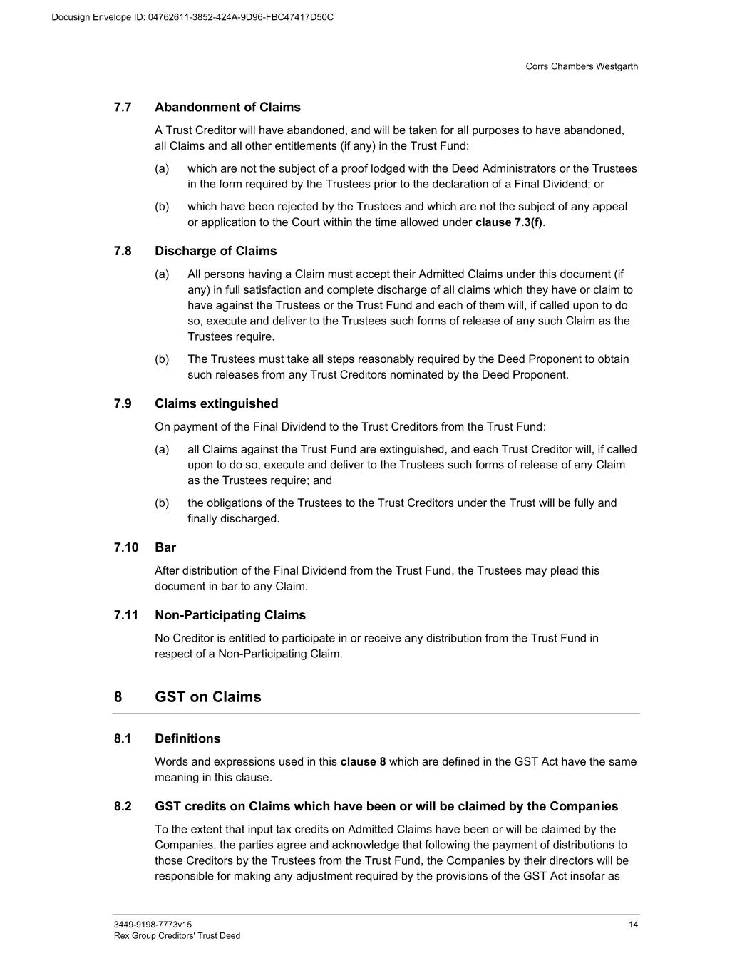 Corrs Chambers Westgarth 3449-9198-7773v15 14 Rex Group Creditors' Trust Deed 7.7 Abandonment of Claims A Trust Creditor will have abandoned, and will be taken for all purposes to have abandoned, all Claims and all other entitlements (if any) in the Trust Fund: (a) which are not the subject of a proof lodged with the Deed Administrators or the Trustees in the form required by the Trustees prior to the declaration of a Final Dividend; or (b) which have been rejected by the Trustees and which are not the subject of any appeal or application to the Court within the time allowed under clause 7.3(f). 7.8 Discharge of Claims (a) All persons having a Claim must accept their Admitted Claims under this document (if any) in full satisfaction and complete discharge of all claims which they have or claim to have against the Trustees or the Trust Fund and each of them will, if called upon to do so, execute and deliver to the Trustees such forms of release of any such Claim as the Trustees require. (b) The Trustees must take all steps reasonably required by the Deed Proponent to obtain such releases from any Trust Creditors nominated by the Deed Proponent. 7.9 Claims extinguished On payment of the Final Dividend to the Trust Creditors from the Trust Fund: (a) all Claims against the Trust Fund are extinguished, and each Trust Creditor will, if called upon to do so, execute and deliver to the Trustees such forms of release of any Claim as the Trustees require; and (b) the obligations of the Trustees to the Trust Creditors under the Trust will be fully and finally discharged. 7.10 Bar After distribution of the Final Dividend from the Trust Fund, the Trustees may plead this document in bar to any Claim. 7.11 Non-Participating Claims No Creditor is entitled to participate in or receive any distribution from the Trust Fund in respect of a Non-Participating Claim. 8 GST on Claims 8.1 Definitions Words and expressions used in this clause 8 which are defined in the GST Act have the same meaning in this clause. 8.2 GST credits on Claims which have been or will be claimed by the Companies To the extent that input tax credits on Admitted Claims have been or will be claimed by the Companies, the parties agree and acknowledge that following the payment of distributions to those Creditors by the Trustees from the Trust Fund, the Companies by their directors will be responsible for making any adjustment required by the provisions of the GST Act insofar as