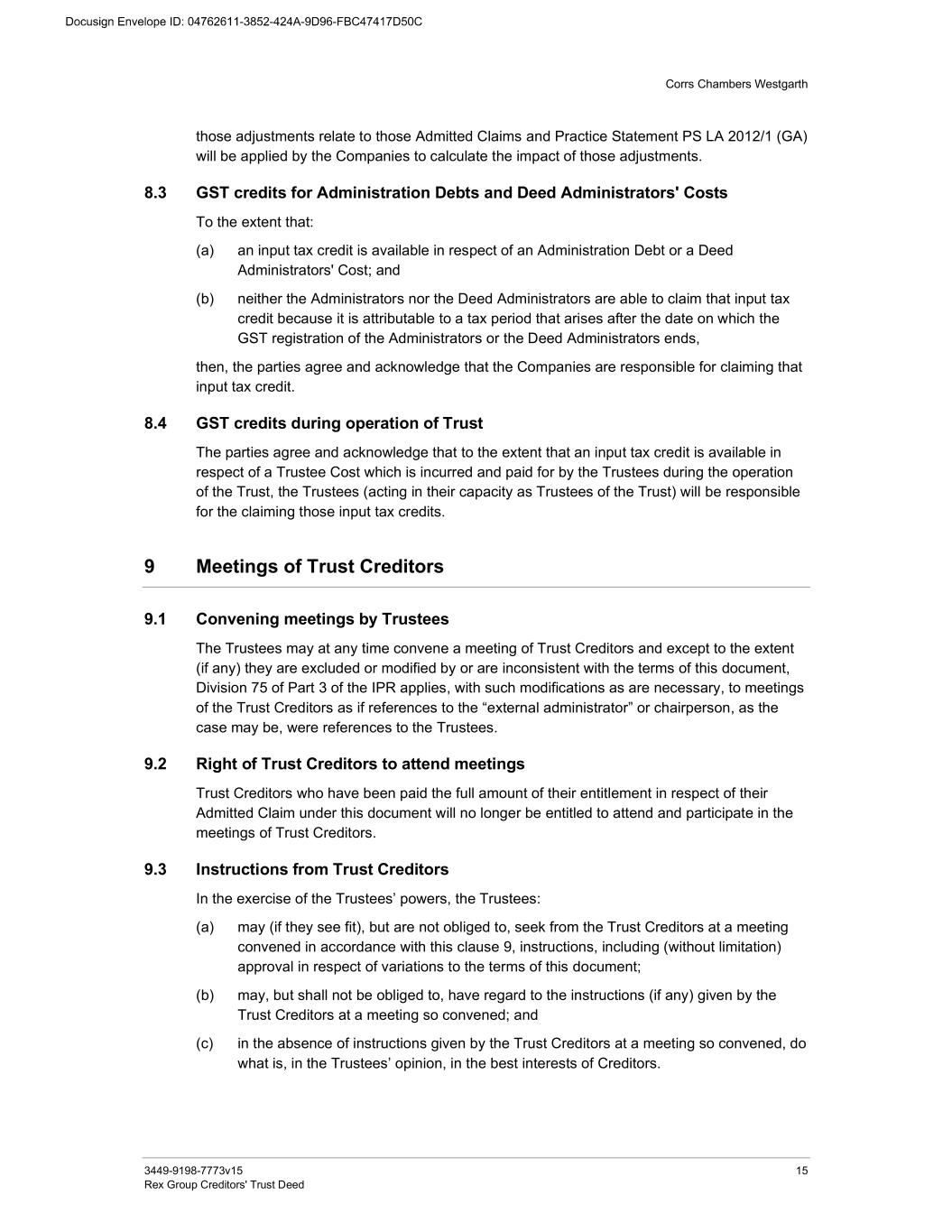 Corrs Chambers Westgarth 3449-9198-7773v15 15 Rex Group Creditors' Trust Deed those adjustments relate to those Admitted Claims and Practice Statement PS LA 2012/1 (GA) will be applied by the Companies to calculate the impact of those adjustments. 8.3 GST credits for Administration Debts and Deed Administrators' Costs To the extent that: (a) an input tax credit is available in respect of an Administration Debt or a Deed Administrators' Cost; and (b) neither the Administrators nor the Deed Administrators are able to claim that input tax credit because it is attributable to a tax period that arises after the date on which the GST registration of the Administrators or the Deed Administrators ends, then, the parties agree and acknowledge that the Companies are responsible for claiming that input tax credit. 8.4 GST credits during operation of Trust The parties agree and acknowledge that to the extent that an input tax credit is available in respect of a Trustee Cost which is incurred and paid for by the Trustees during the operation of the Trust, the Trustees (acting in their capacity as Trustees of the Trust) will be responsible for the claiming those input tax credits. 9 Meetings of Trust Creditors 9.1 Convening meetings by Trustees The Trustees may at any time convene a meeting of Trust Creditors and except to the extent (if any) they are excluded or modified by or are inconsistent with the terms of this document, Division 75 of Part 3 of the IPR applies, with such modifications as are necessary, to meetings of the Trust Creditors as if references to the “external administrator” or chairperson, as the case may be, were references to the Trustees. 9.2 Right of Trust Creditors to attend meetings Trust Creditors who have been paid the full amount of their entitlement in respect of their Admitted Claim under this document will no longer be entitled to attend and participate in the meetings of Trust Creditors. 9.3 Instructions from Trust Creditors In the exercise of the Trustees’ powers, the Trustees: (a) may (if they see fit), but are not obliged to, seek from the Trust Creditors at a meeting convened in accordance with this clause 9, instructions, including (without limitation) approval in respect of variations to the terms of this document; (b) may, but shall not be obliged to, have regard to the instructions (if any) given by the Trust Creditors at a meeting so convened; and (c) in the absence of instructions given by the Trust Creditors at a meeting so convened, do what is, in the Trustees’ opinion, in the best interests of Creditors.