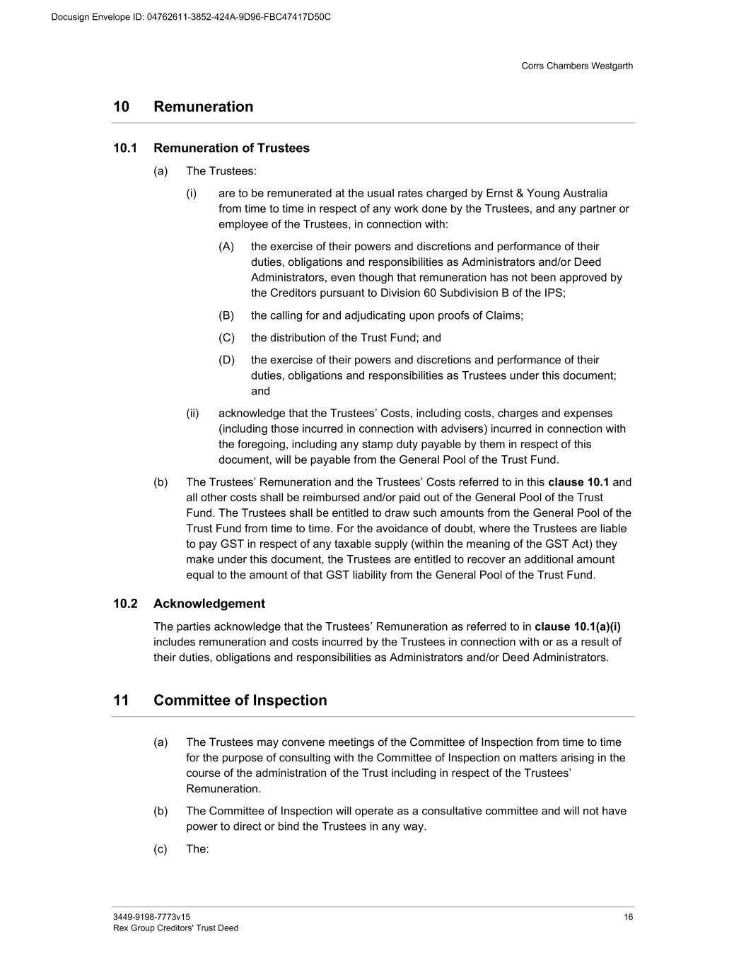 Corrs Chambers Westgarth 3449-9198-7773v15 16 Rex Group Creditors' Trust Deed 10 Remuneration 10.1 Remuneration of Trustees (a) The Trustees: (i) are to be remunerated at the usual rates charged by Ernst & Young Australia from time to time in respect of any work done by the Trustees, and any partner or employee of the Trustees, in connection with: (A) the exercise of their powers and discretions and performance of their duties, obligations and responsibilities as Administrators and/or Deed Administrators, even though that remuneration has not been approved by the Creditors pursuant to Division 60 Subdivision B of the IPS; (B) the calling for and adjudicating upon proofs of Claims; (C) the distribution of the Trust Fund; and (D) the exercise of their powers and discretions and performance of their duties, obligations and responsibilities as Trustees under this document; and (ii) acknowledge that the Trustees’ Costs, including costs, charges and expenses (including those incurred in connection with advisers) incurred in connection with the foregoing, including any stamp duty payable by them in respect of this document, will be payable from the General Pool of the Trust Fund. (b) The Trustees’ Remuneration and the Trustees’ Costs referred to in this clause 10.1 and all other costs shall be reimbursed and/or paid out of the General Pool of the Trust Fund. The Trustees shall be entitled to draw such amounts from the General Pool of the Trust Fund from time to time. For the avoidance of doubt, where the Trustees are liable to pay GST in respect of any taxable supply (within the meaning of the GST Act) they make under this document, the Trustees are entitled to recover an additional amount equal to the amount of that GST liability from the General Pool of the Trust Fund. 10.2 Acknowledgement The parties acknowledge that the Trustees’ Remuneration as referred to in clause 10.1(a)(i) includes remuneration and costs incurred by the Trustees in connection with or as a result of their duties, obligations and responsibilities as Administrators and/or Deed Administrators. 11 Committee of Inspection (a) The Trustees may convene meetings of the Committee of Inspection from time to time for the purpose of consulting with the Committee of Inspection on matters arising in the course of the administration of the Trust including in respect of the Trustees’ Remuneration. (b) The Committee of Inspection will operate as a consultative committee and will not have power to direct or bind the Trustees in any way. (c) The:
