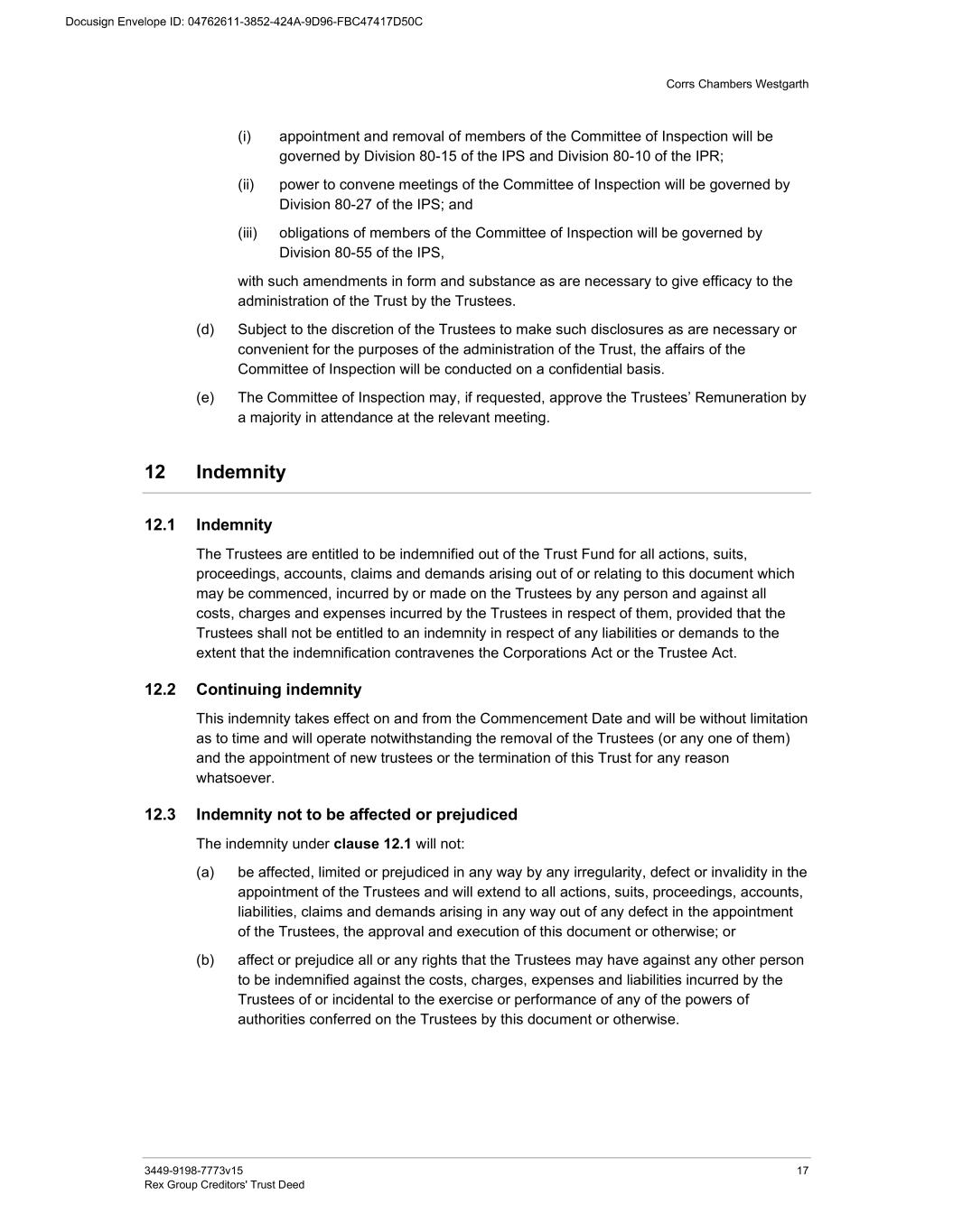 Corrs Chambers Westgarth 3449-9198-7773v15 17 Rex Group Creditors' Trust Deed (i) appointment and removal of members of the Committee of Inspection will be governed by Division 80-15 of the IPS and Division 80-10 of the IPR; (ii) power to convene meetings of the Committee of Inspection will be governed by Division 80-27 of the IPS; and (iii) obligations of members of the Committee of Inspection will be governed by Division 80-55 of the IPS, with such amendments in form and substance as are necessary to give efficacy to the administration of the Trust by the Trustees. (d) Subject to the discretion of the Trustees to make such disclosures as are necessary or convenient for the purposes of the administration of the Trust, the affairs of the Committee of Inspection will be conducted on a confidential basis. (e) The Committee of Inspection may, if requested, approve the Trustees’ Remuneration by a majority in attendance at the relevant meeting. 12 Indemnity 12.1 Indemnity The Trustees are entitled to be indemnified out of the Trust Fund for all actions, suits, proceedings, accounts, claims and demands arising out of or relating to this document which may be commenced, incurred by or made on the Trustees by any person and against all costs, charges and expenses incurred by the Trustees in respect of them, provided that the Trustees shall not be entitled to an indemnity in respect of any liabilities or demands to the extent that the indemnification contravenes the Corporations Act or the Trustee Act. 12.2 Continuing indemnity This indemnity takes effect on and from the Commencement Date and will be without limitation as to time and will operate notwithstanding the removal of the Trustees (or any one of them) and the appointment of new trustees or the termination of this Trust for any reason whatsoever. 12.3 Indemnity not to be affected or prejudiced The indemnity under clause 12.1 will not: (a) be affected, limited or prejudiced in any way by any irregularity, defect or invalidity in the appointment of the Trustees and will extend to all actions, suits, proceedings, accounts, liabilities, claims and demands arising in any way out of any defect in the appointment of the Trustees, the approval and execution of this document or otherwise; or (b) affect or prejudice all or any rights that the Trustees may have against any other person to be indemnified against the costs, charges, expenses and liabilities incurred by the Trustees of or incidental to the exercise or performance of any of the powers of authorities conferred on the Trustees by this document or otherwise.