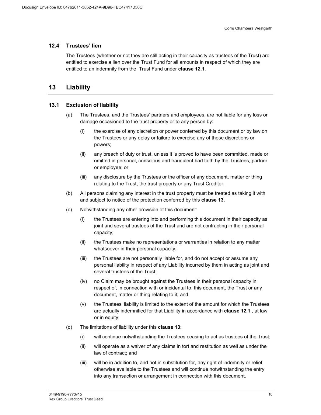 Corrs Chambers Westgarth 3449-9198-7773v15 18 Rex Group Creditors' Trust Deed 12.4 Trustees’ lien The Trustees (whether or not they are still acting in their capacity as trustees of the Trust) are entitled to exercise a lien over the Trust Fund for all amounts in respect of which they are entitled to an indemnity from the Trust Fund under clause 12.1. 13 Liability 13.1 Exclusion of liability (a) The Trustees, and the Trustees’ partners and employees, are not liable for any loss or damage occasioned to the trust property or to any person by: (i) the exercise of any discretion or power conferred by this document or by law on the Trustees or any delay or failure to exercise any of those discretions or powers; (ii) any breach of duty or trust, unless it is proved to have been committed, made or omitted in personal, conscious and fraudulent bad faith by the Trustees, partner or employee; or (iii) any disclosure by the Trustees or the officer of any document, matter or thing relating to the Trust, the trust property or any Trust Creditor. (b) All persons claiming any interest in the trust property must be treated as taking it with and subject to notice of the protection conferred by this clause 13. (c) Notwithstanding any other provision of this document: (i) the Trustees are entering into and performing this document in their capacity as joint and several trustees of the Trust and are not contracting in their personal capacity; (ii) the Trustees make no representations or warranties in relation to any matter whatsoever in their personal capacity; (iii) the Trustees are not personally liable for, and do not accept or assume any personal liability in respect of any Liability incurred by them in acting as joint and several trustees of the Trust; (iv) no Claim may be brought against the Trustees in their personal capacity in respect of, in connection with or incidental to, this document, the Trust or any document, matter or thing relating to it; and (v) the Trustees’ liability is limited to the extent of the amount for which the Trustees are actually indemnified for that Liability in accordance with clause 12.1 , at law or in equity; (d) The limitations of liability under this clause 13: (i) will continue notwithstanding the Trustees ceasing to act as trustees of the Trust; (ii) will operate as a waiver of any claims in tort and restitution as well as under the law of contract; and (iii) will be in addition to, and not in substitution for, any right of indemnity or relief otherwise available to the Trustees and will continue notwithstanding the entry into any transaction or arrangement in connection with this document.