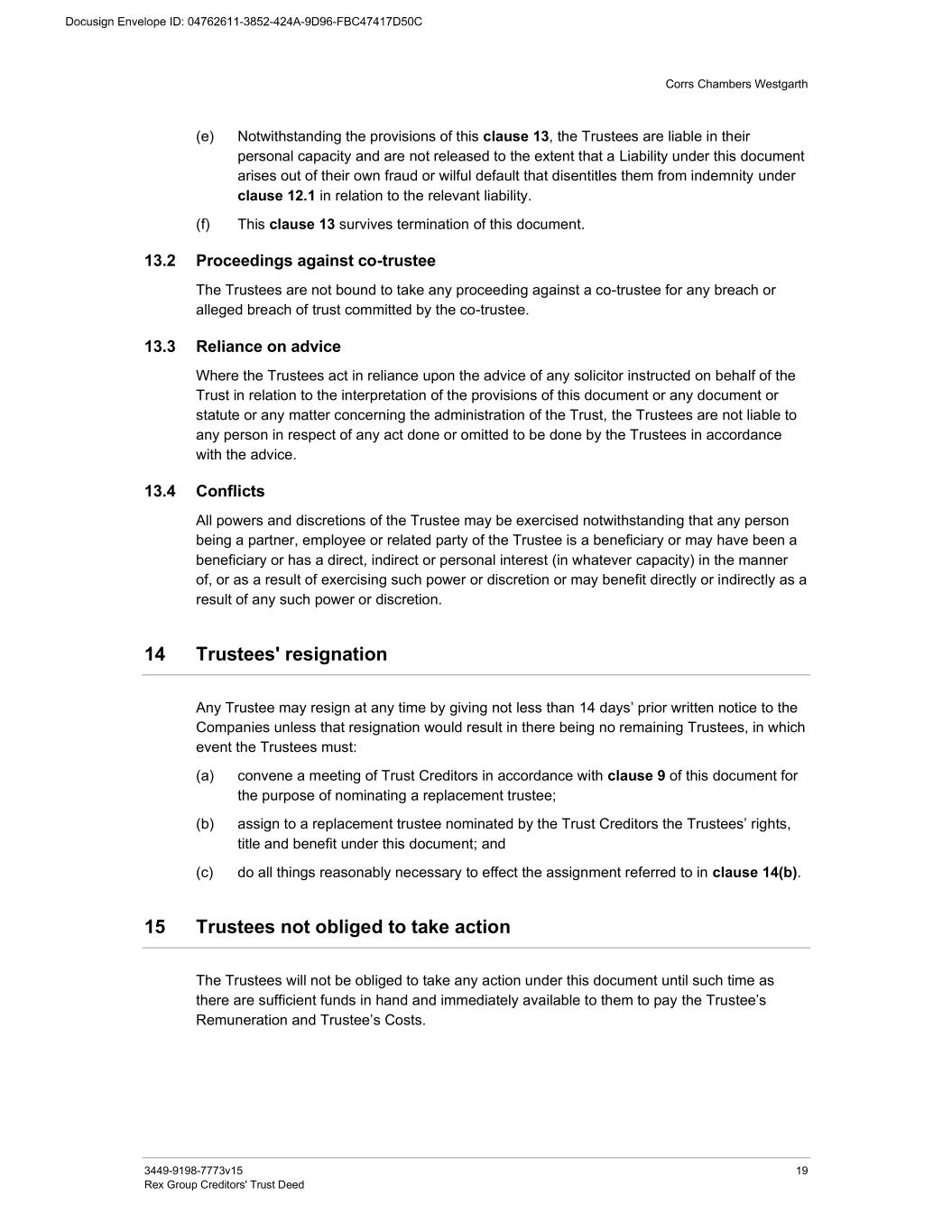 Corrs Chambers Westgarth 3449-9198-7773v15 19 Rex Group Creditors' Trust Deed (e) Notwithstanding the provisions of this clause 13, the Trustees are liable in their personal capacity and are not released to the extent that a Liability under this document arises out of their own fraud or wilful default that disentitles them from indemnity under clause 12.1 in relation to the relevant liability. (f) This clause 13 survives termination of this document. 13.2 Proceedings against co-trustee The Trustees are not bound to take any proceeding against a co-trustee for any breach or alleged breach of trust committed by the co-trustee. 13.3 Reliance on advice Where the Trustees act in reliance upon the advice of any solicitor instructed on behalf of the Trust in relation to the interpretation of the provisions of this document or any document or statute or any matter concerning the administration of the Trust, the Trustees are not liable to any person in respect of any act done or omitted to be done by the Trustees in accordance with the advice. 13.4 Conflicts All powers and discretions of the Trustee may be exercised notwithstanding that any person being a partner, employee or related party of the Trustee is a beneficiary or may have been a beneficiary or has a direct, indirect or personal interest (in whatever capacity) in the manner of, or as a result of exercising such power or discretion or may benefit directly or indirectly as a result of any such power or discretion. 14 Trustees' resignation Any Trustee may resign at any time by giving not less than 14 days’ prior written notice to the Companies unless that resignation would result in there being no remaining Trustees, in which event the Trustees must: (a) convene a meeting of Trust Creditors in accordance with clause 9 of this document for the purpose of nominating a replacement trustee; (b) assign to a replacement trustee nominated by the Trust Creditors the Trustees’ rights, title and benefit under this document; and (c) do all things reasonably necessary to effect the assignment referred to in clause 14(b). 15 Trustees not obliged to take action The Trustees will not be obliged to take any action under this document until such time as there are sufficient funds in hand and immediately available to them to pay the Trustee’s Remuneration and Trustee’s Costs.