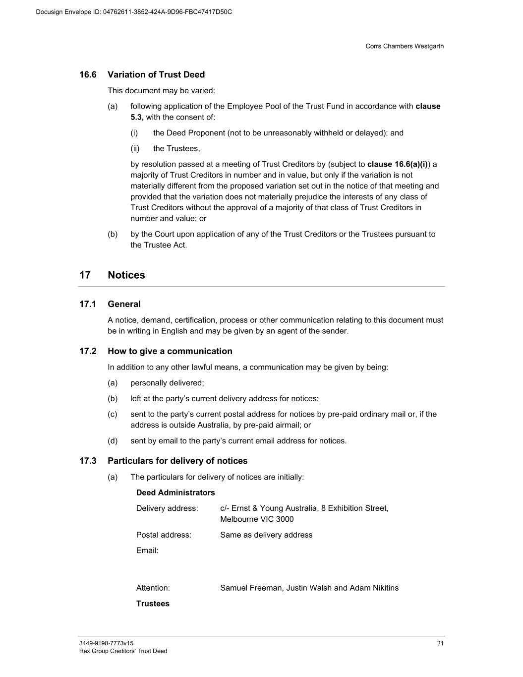 Corrs Chambers Westgarth 3449-9198-7773v15 21 Rex Group Creditors' Trust Deed 16.6 Variation of Trust Deed This document may be varied: (a) following application of the Employee Pool of the Trust Fund in accordance with clause 5.3, with the consent of: (i) the Deed Proponent (not to be unreasonably withheld or delayed); and (ii) the Trustees, by resolution passed at a meeting of Trust Creditors by (subject to clause 16.6(a)(i)) a majority of Trust Creditors in number and in value, but only if the variation is not materially different from the proposed variation set out in the notice of that meeting and provided that the variation does not materially prejudice the interests of any class of Trust Creditors without the approval of a majority of that class of Trust Creditors in number and value; or (b) by the Court upon application of any of the Trust Creditors or the Trustees pursuant to the Trustee Act. 17 Notices 17.1 General A notice, demand, certification, process or other communication relating to this document must be in writing in English and may be given by an agent of the sender. 17.2 How to give a communication In addition to any other lawful means, a communication may be given by being: (a) personally delivered; (b) left at the party’s current delivery address for notices; (c) sent to the party’s current postal address for notices by pre-paid ordinary mail or, if the address is outside Australia, by pre-paid airmail; or (d) sent by email to the party’s current email address for notices. 17.3 Particulars for delivery of notices (a) The particulars for delivery of notices are initially: Deed Administrators Delivery address: c/- Ernst & Young Australia, 8 Exhibition Street, Melbourne VIC 3000 Postal address: Same as delivery address Email: Attention: Samuel Freeman, Justin Walsh and Adam Nikitins Trustees