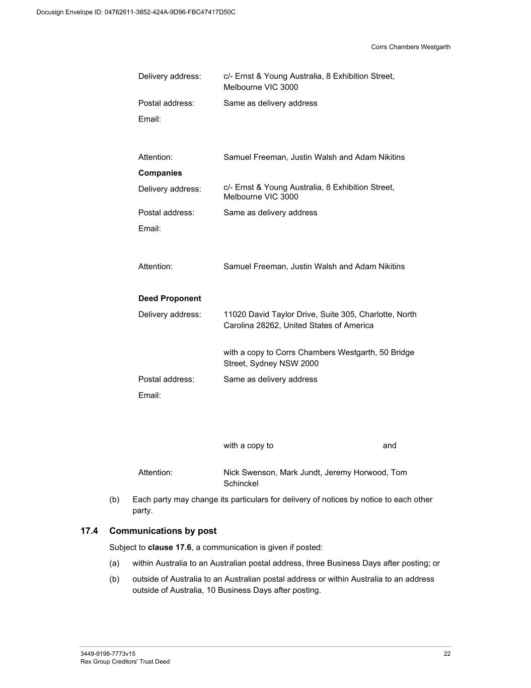 Corrs Chambers Westgarth 3449-9198-7773v15 22 Rex Group Creditors' Trust Deed Delivery address: c/- Ernst & Young Australia, 8 Exhibition Street, Melbourne VIC 3000 Postal address: Same as delivery address Email: Attention: Samuel Freeman, Justin Walsh and Adam Nikitins Companies Delivery address: c/- Ernst & Young Australia, 8 Exhibition Street, Melbourne VIC 3000 Postal address: Same as delivery address Email: Attention: Samuel Freeman, Justin Walsh and Adam Nikitins Deed Proponent Delivery address: 11020 David Taylor Drive, Suite 305, Charlotte, North Carolina 28262, United States of America with a copy to Corrs Chambers Westgarth, 50 Bridge Street, Sydney NSW 2000 Postal address: Same as delivery address Email: with a copy to and Attention: Nick Swenson, Mark Jundt, Jeremy Horwood, Tom Schinckel (b) Each party may change its particulars for delivery of notices by notice to each other party. 17.4 Communications by post Subject to clause 17.6, a communication is given if posted: (a) within Australia to an Australian postal address, three Business Days after posting; or (b) outside of Australia to an Australian postal address or within Australia to an address outside of Australia, 10 Business Days after posting.