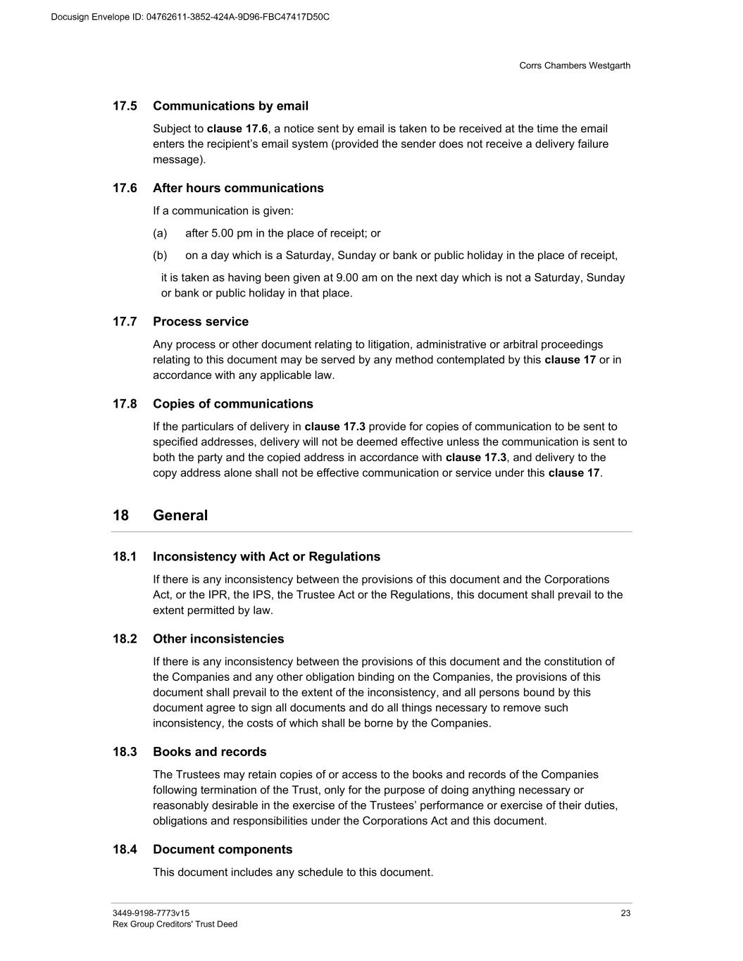 Corrs Chambers Westgarth 3449-9198-7773v15 23 Rex Group Creditors' Trust Deed 17.5 Communications by email Subject to clause 17.6, a notice sent by email is taken to be received at the time the email enters the recipient’s email system (provided the sender does not receive a delivery failure message). 17.6 After hours communications If a communication is given: (a) after 5.00 pm in the place of receipt; or (b) on a day which is a Saturday, Sunday or bank or public holiday in the place of receipt, it is taken as having been given at 9.00 am on the next day which is not a Saturday, Sunday or bank or public holiday in that place. 17.7 Process service Any process or other document relating to litigation, administrative or arbitral proceedings relating to this document may be served by any method contemplated by this clause 17 or in accordance with any applicable law. 17.8 Copies of communications If the particulars of delivery in clause 17.3 provide for copies of communication to be sent to specified addresses, delivery will not be deemed effective unless the communication is sent to both the party and the copied address in accordance with clause 17.3, and delivery to the copy address alone shall not be effective communication or service under this clause 17. 18 General 18.1 Inconsistency with Act or Regulations If there is any inconsistency between the provisions of this document and the Corporations Act, or the IPR, the IPS, the Trustee Act or the Regulations, this document shall prevail to the extent permitted by law. 18.2 Other inconsistencies If there is any inconsistency between the provisions of this document and the constitution of the Companies and any other obligation binding on the Companies, the provisions of this document shall prevail to the extent of the inconsistency, and all persons bound by this document agree to sign all documents and do all things necessary to remove such inconsistency, the costs of which shall be borne by the Companies. 18.3 Books and records The Trustees may retain copies of or access to the books and records of the Companies following termination of the Trust, only for the purpose of doing anything necessary or reasonably desirable in the exercise of the Trustees’ performance or exercise of their duties, obligations and responsibilities under the Corporations Act and this document. 18.4 Document components This document includes any schedule to this document.