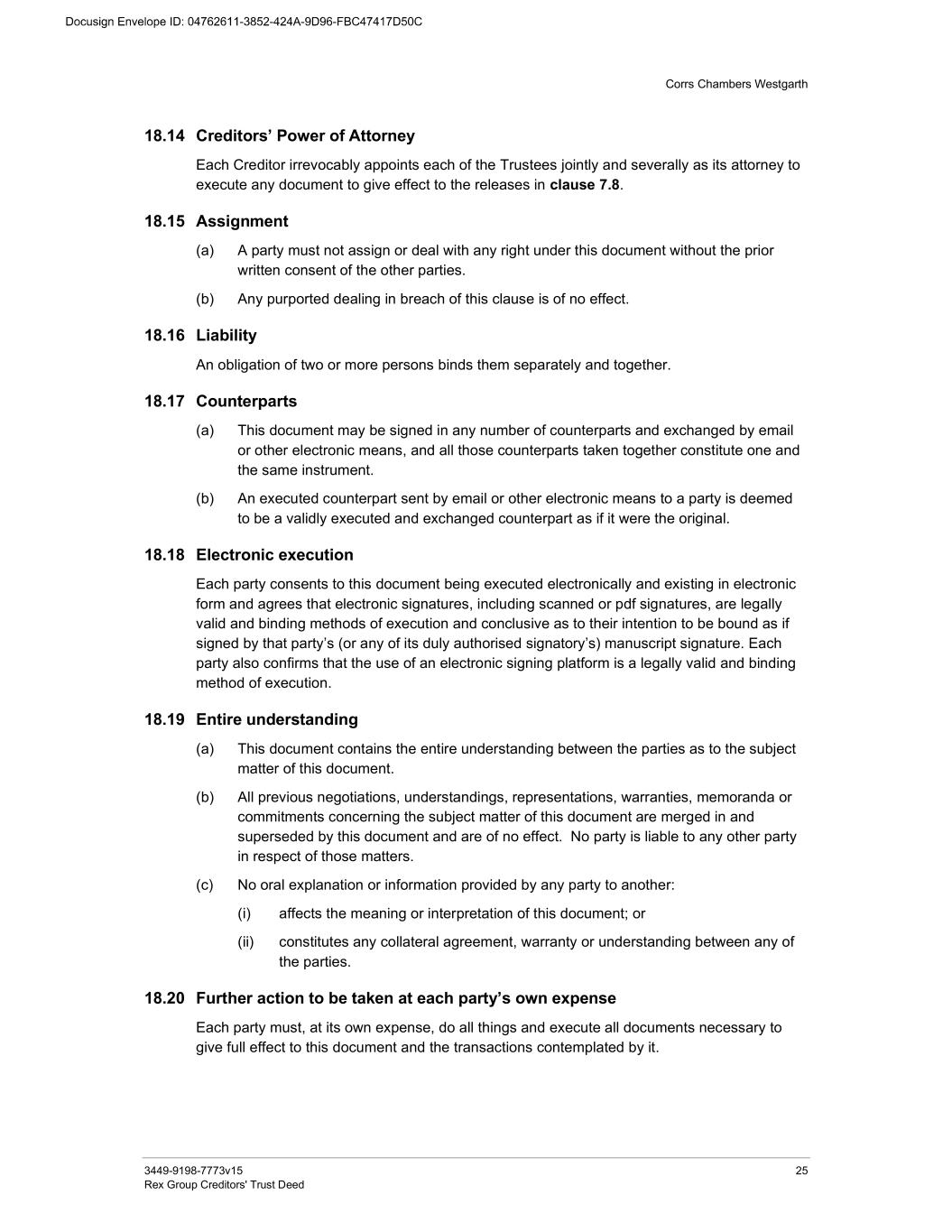 Corrs Chambers Westgarth 3449-9198-7773v15 25 Rex Group Creditors' Trust Deed 18.14 Creditors’ Power of Attorney Each Creditor irrevocably appoints each of the Trustees jointly and severally as its attorney to execute any document to give effect to the releases in clause 7.8. 18.15 Assignment (a) A party must not assign or deal with any right under this document without the prior written consent of the other parties. (b) Any purported dealing in breach of this clause is of no effect. 18.16 Liability An obligation of two or more persons binds them separately and together. 18.17 Counterparts (a) This document may be signed in any number of counterparts and exchanged by email or other electronic means, and all those counterparts taken together constitute one and the same instrument. (b) An executed counterpart sent by email or other electronic means to a party is deemed to be a validly executed and exchanged counterpart as if it were the original. 18.18 Electronic execution Each party consents to this document being executed electronically and existing in electronic form and agrees that electronic signatures, including scanned or pdf signatures, are legally valid and binding methods of execution and conclusive as to their intention to be bound as if signed by that party’s (or any of its duly authorised signatory’s) manuscript signature. Each party also confirms that the use of an electronic signing platform is a legally valid and binding method of execution. 18.19 Entire understanding (a) This document contains the entire understanding between the parties as to the subject matter of this document. (b) All previous negotiations, understandings, representations, warranties, memoranda or commitments concerning the subject matter of this document are merged in and superseded by this document and are of no effect. No party is liable to any other party in respect of those matters. (c) No oral explanation or information provided by any party to another: (i) affects the meaning or interpretation of this document; or (ii) constitutes any collateral agreement, warranty or understanding between any of the parties. 18.20 Further action to be taken at each party’s own expense Each party must, at its own expense, do all things and execute all documents necessary to give full effect to this document and the transactions contemplated by it.