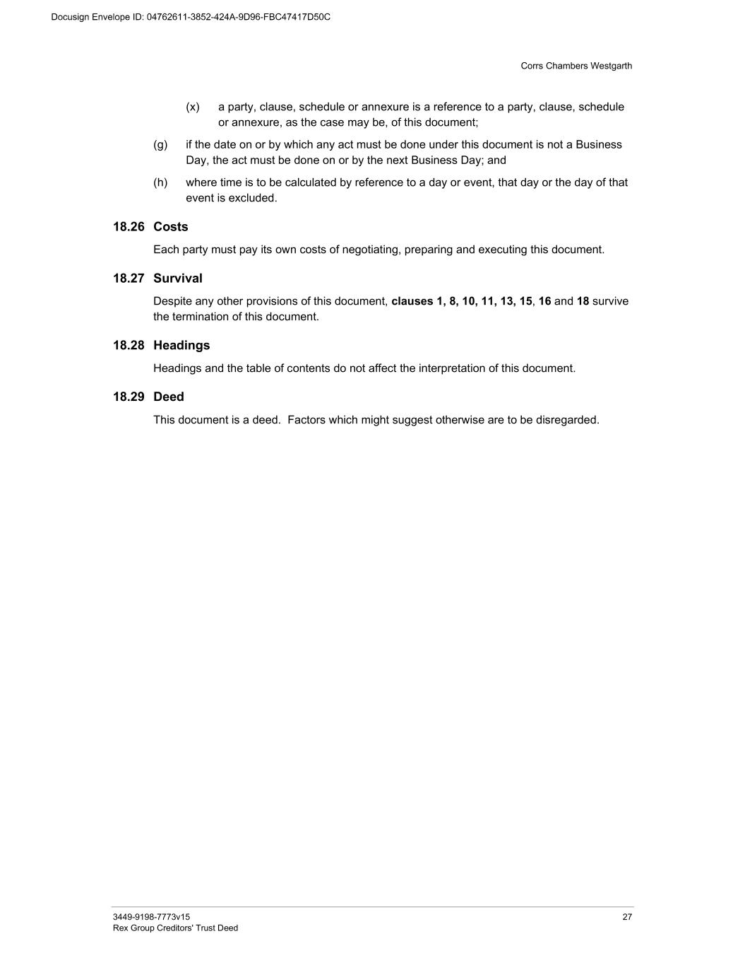 Corrs Chambers Westgarth 3449-9198-7773v15 27 Rex Group Creditors' Trust Deed (x) a party, clause, schedule or annexure is a reference to a party, clause, schedule or annexure, as the case may be, of this document; (g) if the date on or by which any act must be done under this document is not a Business Day, the act must be done on or by the next Business Day; and (h) where time is to be calculated by reference to a day or event, that day or the day of that event is excluded. 18.26 Costs Each party must pay its own costs of negotiating, preparing and executing this document. 18.27 Survival Despite any other provisions of this document, clauses 1, 8, 10, 11, 13, 15, 16 and 18 survive the termination of this document. 18.28 Headings Headings and the table of contents do not affect the interpretation of this document. 18.29 Deed This document is a deed. Factors which might suggest otherwise are to be disregarded.