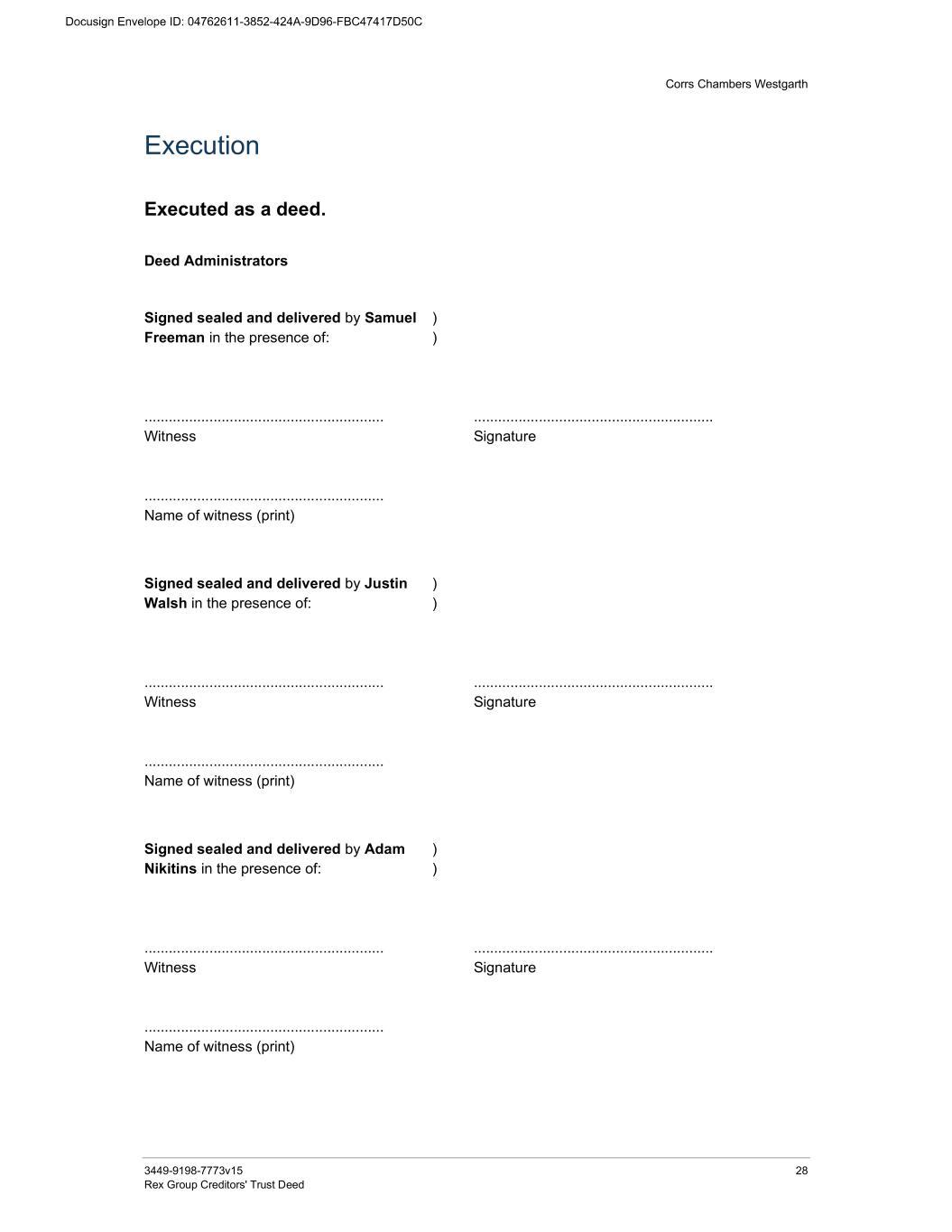 Corrs Chambers Westgarth 3449-9198-7773v15 28 Rex Group Creditors' Trust Deed Execution Executed as a deed. Deed Administrators Signed sealed and delivered by Samuel Freeman in the presence of: ) ) ........................................................... Witness ........................................................... Name of witness (print) ........................................................... Signature Signed sealed and delivered by Justin Walsh in the presence of: ) ) ........................................................... Witness ........................................................... Name of witness (print) ........................................................... Signature Signed sealed and delivered by Adam Nikitins in the presence of: ) ) ........................................................... Witness ........................................................... Name of witness (print) ........................................................... Signature