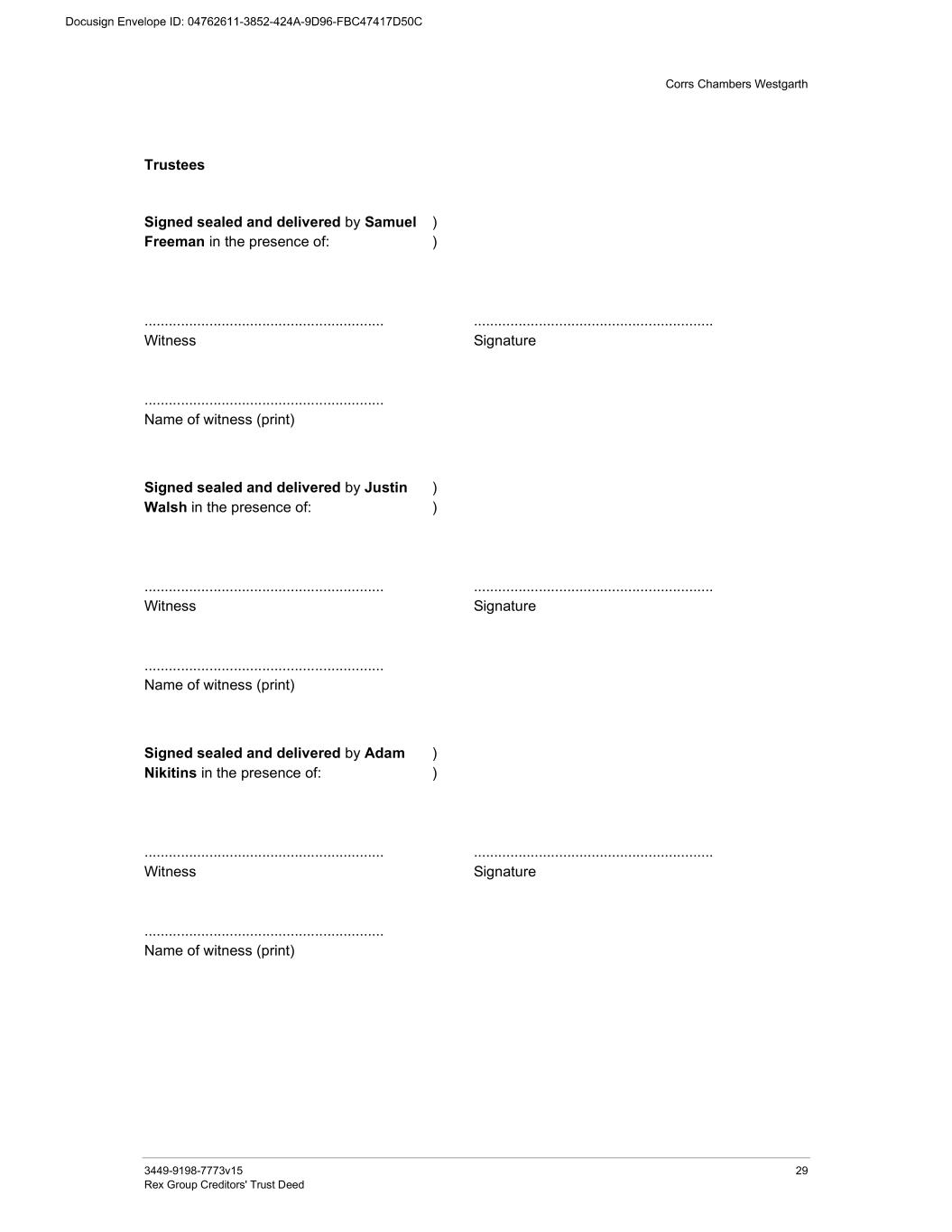 Corrs Chambers Westgarth 3449-9198-7773v15 29 Rex Group Creditors' Trust Deed Trustees Signed sealed and delivered by Samuel Freeman in the presence of: ) ) ........................................................... Witness ........................................................... Name of witness (print) ........................................................... Signature Signed sealed and delivered by Justin Walsh in the presence of: ) ) ........................................................... Witness ........................................................... Name of witness (print) ........................................................... Signature Signed sealed and delivered by Adam Nikitins in the presence of: ) ) ........................................................... Witness ........................................................... Name of witness (print) ........................................................... Signature