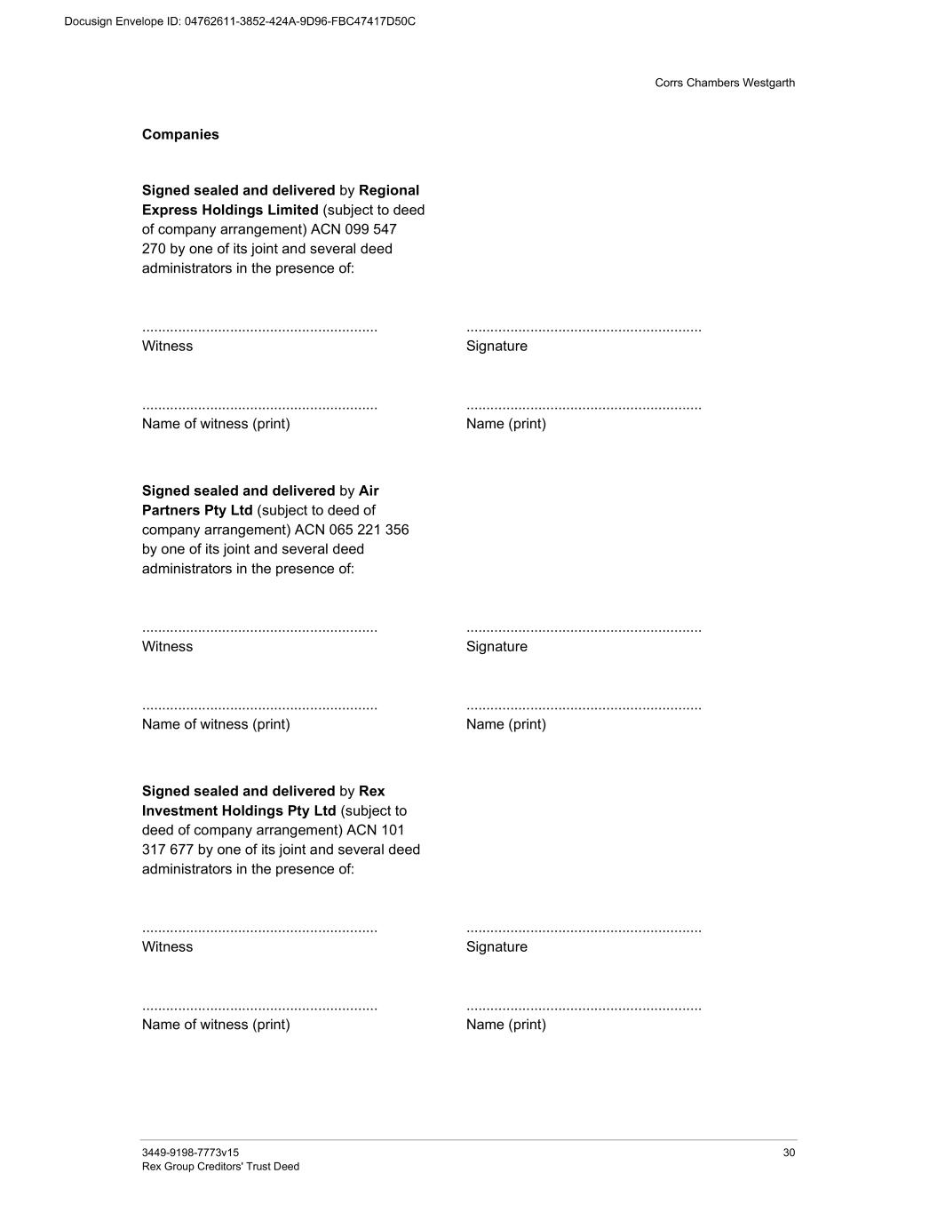 Corrs Chambers Westgarth 3449-9198-7773v15 30 Rex Group Creditors' Trust Deed Companies Signed sealed and delivered by Regional Express Holdings Limited (subject to deed of company arrangement) ACN 099 547 270 by one of its joint and several deed administrators in the presence of: ........................................................... Witness ........................................................... Name of witness (print) ........................................................... Signature ........................................................... Name (print) Signed sealed and delivered by Air Partners Pty Ltd (subject to deed of company arrangement) ACN 065 221 356 by one of its joint and several deed administrators in the presence of: ........................................................... Witness ........................................................... Name of witness (print) ........................................................... Signature ........................................................... Name (print) Signed sealed and delivered by Rex Investment Holdings Pty Ltd (subject to deed of company arrangement) ACN 101 317 677 by one of its joint and several deed administrators in the presence of: ........................................................... Witness ........................................................... Name of witness (print) ........................................................... Signature ........................................................... Name (print)
