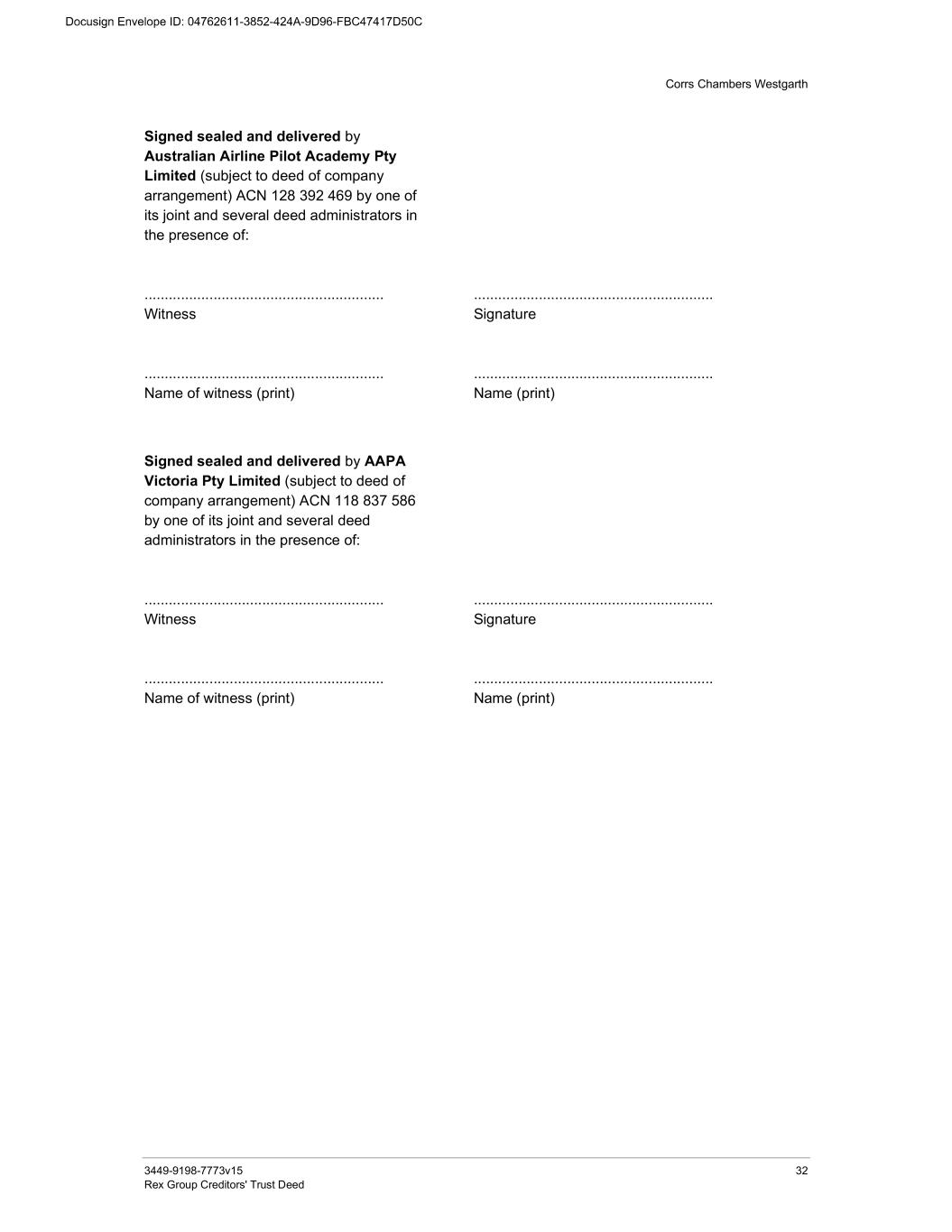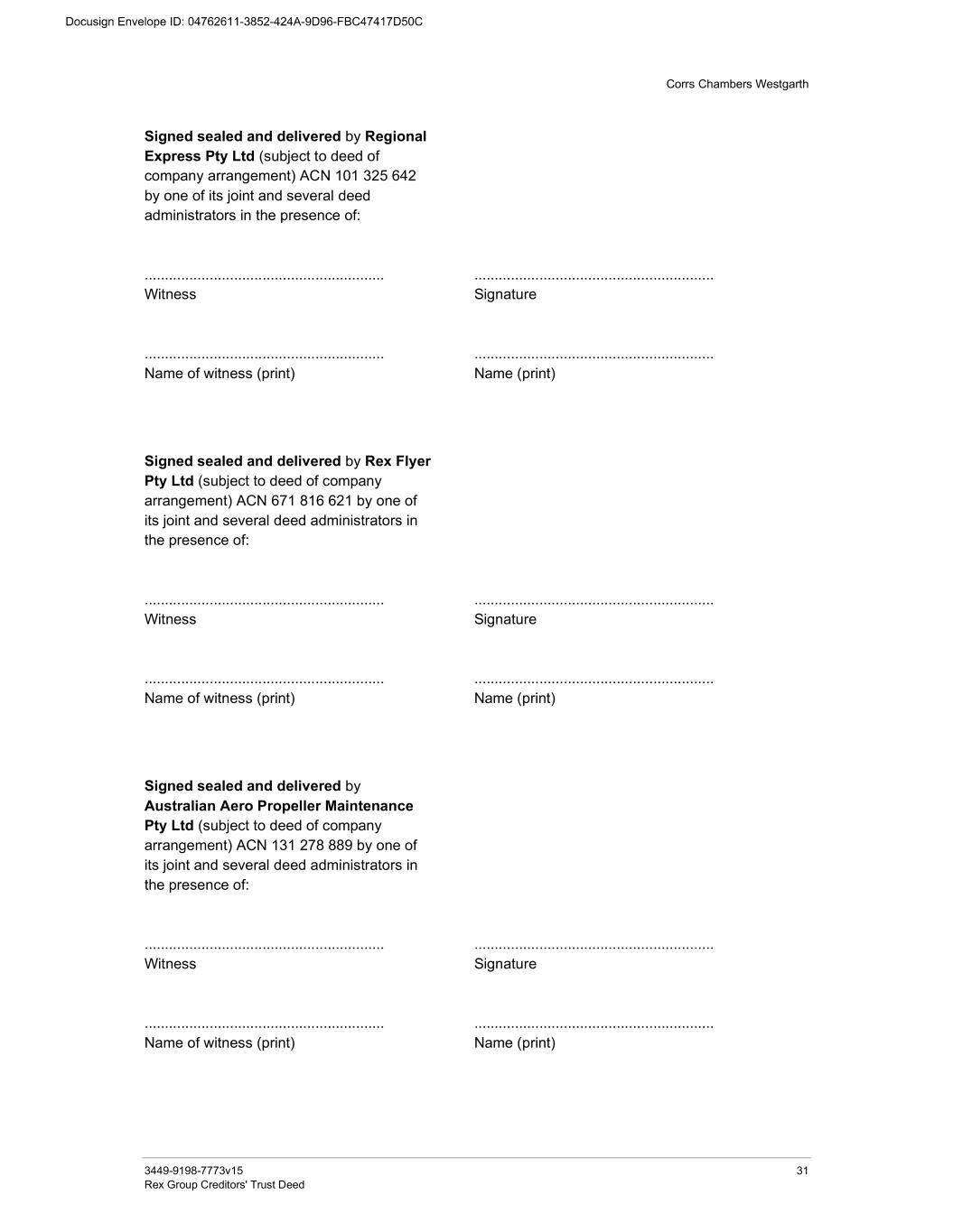Corrs Chambers Westgarth 3449-9198-7773v15 31 Rex Group Creditors' Trust Deed Signed sealed and delivered by Regional Express Pty Ltd (subject to deed of company arrangement) ACN 101 325 642 by one of its joint and several deed administrators in the presence of: ........................................................... Witness ........................................................... Name of witness (print) ........................................................... Signature ........................................................... Name (print) Signed sealed and delivered by Rex Flyer Pty Ltd (subject to deed of company arrangement) ACN 671 816 621 by one of its joint and several deed administrators in the presence of: ........................................................... Witness ........................................................... Name of witness (print) ........................................................... Signature ........................................................... Name (print) Signed sealed and delivered by Australian Aero Propeller Maintenance Pty Ltd (subject to deed of company arrangement) ACN 131 278 889 by one of its joint and several deed administrators in the presence of: ........................................................... Witness ........................................................... Name of witness (print) ........................................................... Signature ........................................................... Name (print)