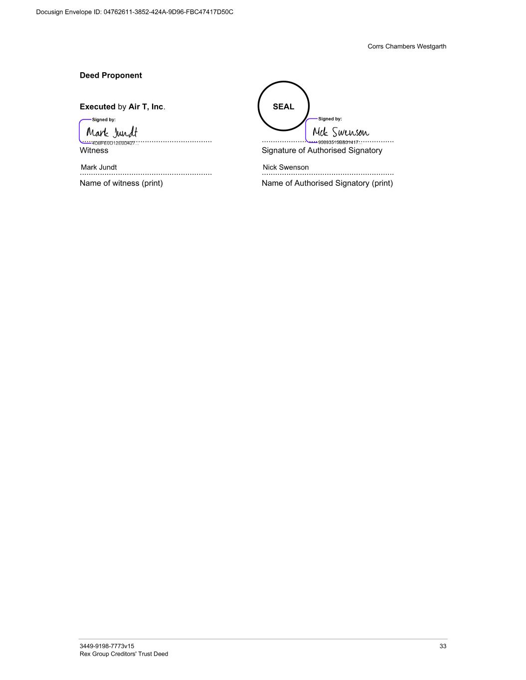 Corrs Chambers Westgarth 3449-9198-7773v15 33 Rex Group Creditors' Trust Deed Deed Proponent Executed by Air T, Inc. SEAL ........................................................... Witness ........................................................... Name of witness (print) ........................................................... Signature of Authorised Signatory ........................................................... Name of Authorised Signatory (print)