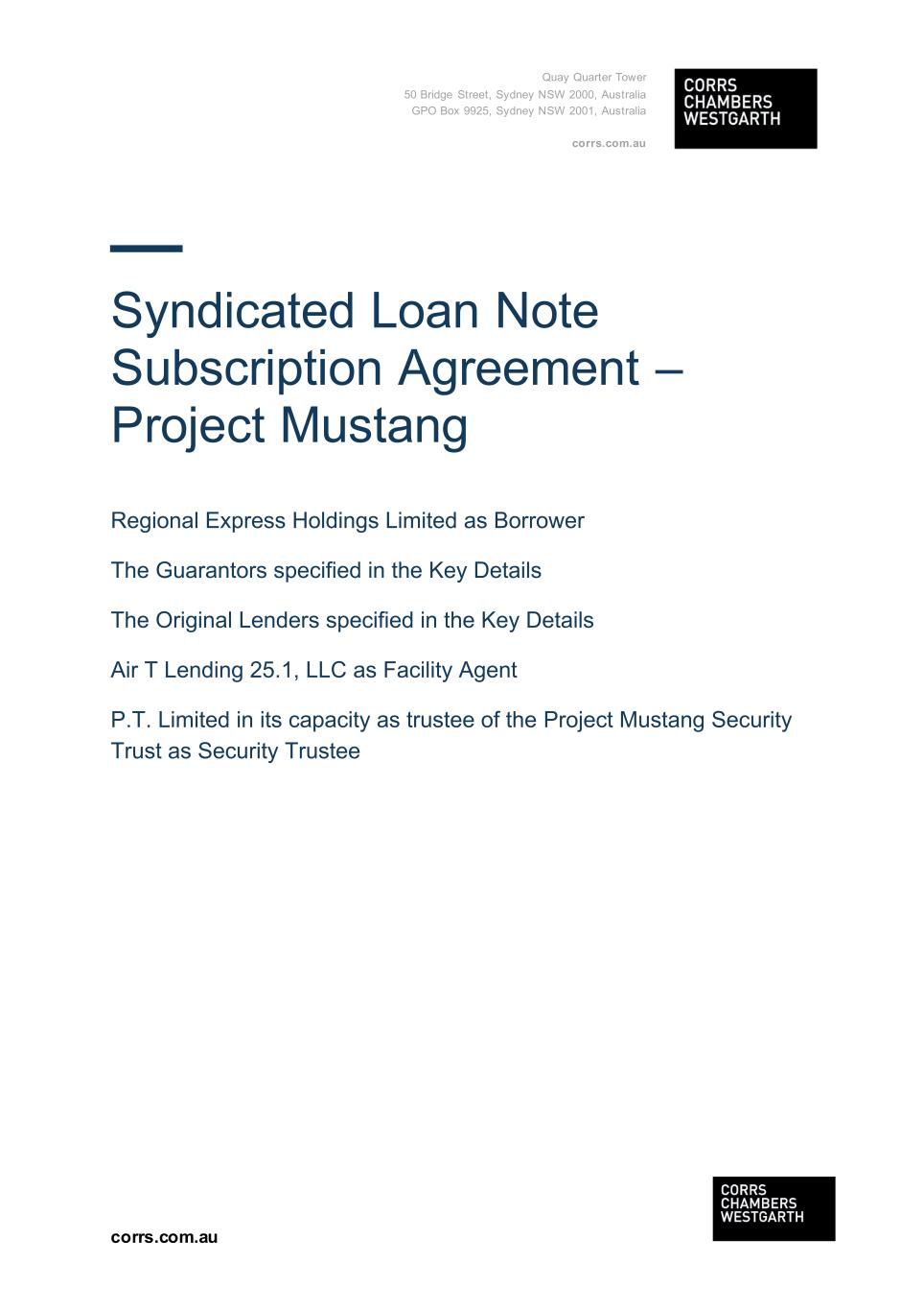 corrs.com.au Quay Quarter Tower 50 Bridge Street, Sydney NSW 2000, Australia GPO Box 9925, Sydney NSW 2001, Australia corrs.com.au Syndicated Loan Note Subscription Agreement – Project Mustang Regional Express Holdings Limited as Borrower The Guarantors specified in the Key Details The Original Lenders specified in the Key Details Air T Lending 25.1, LLC as Facility Agent P.T. Limited in its capacity as trustee of the Project Mustang Security Trust as Security Trustee