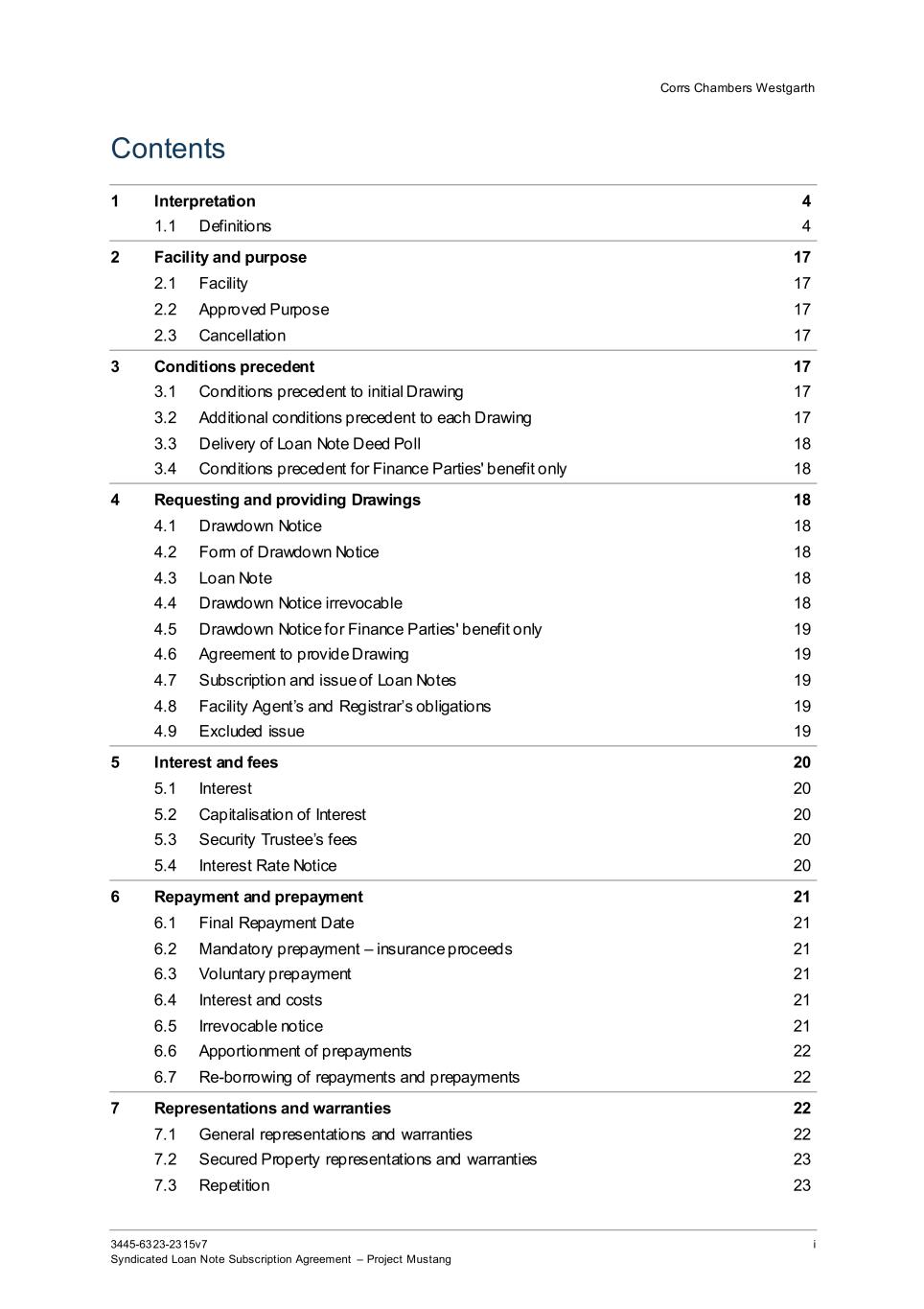 Corrs Chambers Westgarth 3445-6323-2315v7 i Syndicated Loan Note Subscription Agreement – Project Mustang Contents 1 Interpretation 4 1.1 Definitions 4 2 Facility and purpose 17 2.1 Facility 17 2.2 Approved Purpose 17 2.3 Cancellation 17 3 Conditions precedent 17 3.1 Conditions precedent to initial Drawing 17 3.2 Additional conditions precedent to each Drawing 17 3.3 Delivery of Loan Note Deed Poll 18 3.4 Conditions precedent for Finance Parties' benefit only 18 4 Requesting and providing Drawings 18 4.1 Drawdown Notice 18 4.2 Form of Drawdown Notice 18 4.3 Loan Note 18 4.4 Drawdown Notice irrevocable 18 4.5 Drawdown Notice for Finance Parties' benefit only 19 4.6 Agreement to provide Drawing 19 4.7 Subscription and issue of Loan Notes 19 4.8 Facility Agent’s and Registrar’s obligations 19 4.9 Excluded issue 19 5 Interest and fees 20 5.1 Interest 20 5.2 Capitalisation of Interest 20 5.3 Security Trustee’s fees 20 5.4 Interest Rate Notice 20 6 Repayment and prepayment 21 6.1 Final Repayment Date 21 6.2 Mandatory prepayment – insurance proceeds 21 6.3 Voluntary prepayment 21 6.4 Interest and costs 21 6.5 Irrevocable notice 21 6.6 Apportionment of prepayments 22 6.7 Re-borrowing of repayments and prepayments 22 7 Representations and warranties 22 7.1 General representations and warranties 22 7.2 Secured Property representations and warranties 23 7.3 Repetition 23