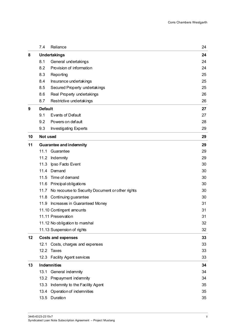 Corrs Chambers Westgarth 3445-6323-2315v7 ii Syndicated Loan Note Subscription Agreement – Project Mustang 7.4 Reliance 24 8 Undertakings 24 8.1 General undertakings 24 8.2 Provision of information 24 8.3 Reporting 25 8.4 Insurance undertakings 25 8.5 Secured Property undertakings 25 8.6 Real Property undertakings 26 8.7 Restrictive undertakings 26 9 Default 27 9.1 Events of Default 27 9.2 Powers on default 28 9.3 Investigating Experts 29 10 Not used 29 11 Guarantee and indemnity 29 11.1 Guarantee 29 11.2 Indemnity 29 11.3 Ipso Facto Event 30 11.4 Demand 30 11.5 Time of demand 30 11.6 Principal obligations 30 11.7 No recourse to Security Document or other rights 30 11.8 Continuing guarantee 30 11.9 Increases in Guaranteed Money 31 11.10 Contingent amounts 31 11.11 Preservation 31 11.12 No obligation to marshal 32 11.13 Suspension of rights 32 12 Costs and expenses 33 12.1 Costs, charges and expenses 33 12.2 Taxes 33 12.3 Facility Agent services 33 13 Indemnities 34 13.1 General indemnity 34 13.2 Prepayment indemnity 34 13.3 Indemnity to the Facility Agent 35 13.4 Operation of indemnities 35 13.5 Duration 35
