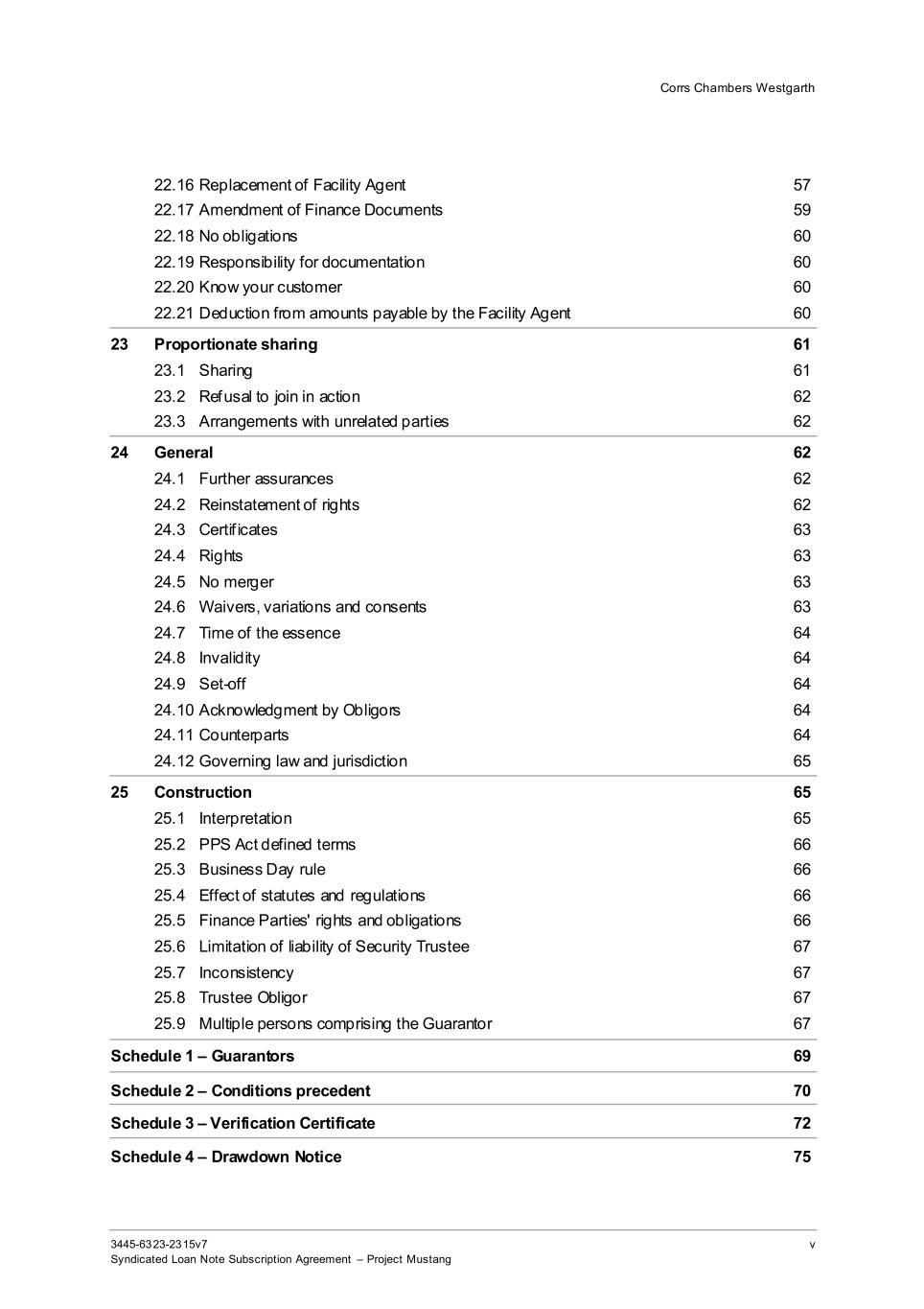Corrs Chambers Westgarth 3445-6323-2315v7 v Syndicated Loan Note Subscription Agreement – Project Mustang 22.16 Replacement of Facility Agent 57 22.17 Amendment of Finance Documents 59 22.18 No obligations 60 22.19 Responsibility for documentation 60 22.20 Know your customer 60 22.21 Deduction from amounts payable by the Facility Agent 60 23 Proportionate sharing 61 23.1 Sharing 61 23.2 Refusal to join in action 62 23.3 Arrangements with unrelated parties 62 24 General 62 24.1 Further assurances 62 24.2 Reinstatement of rights 62 24.3 Certif icates 63 24.4 Rights 63 24.5 No merger 63 24.6 Waivers, variations and consents 63 24.7 Time of the essence 64 24.8 Invalidity 64 24.9 Set-off 64 24.10 Acknowledgment by Obligors 64 24.11 Counterparts 64 24.12 Governing law and jurisdiction 65 25 Construction 65 25.1 Interpretation 65 25.2 PPS Act defined terms 66 25.3 Business Day rule 66 25.4 Effect of statutes and regulations 66 25.5 Finance Parties' rights and obligations 66 25.6 Limitation of liability of Security Trustee 67 25.7 Inconsistency 67 25.8 Trustee Obligor 67 25.9 Multiple persons comprising the Guarantor 67 Schedule 1 – Guarantors 69 Schedule 2 – Conditions precedent 70 Schedule 3 – Verification Certificate 72 Schedule 4 – Drawdown Notice 75