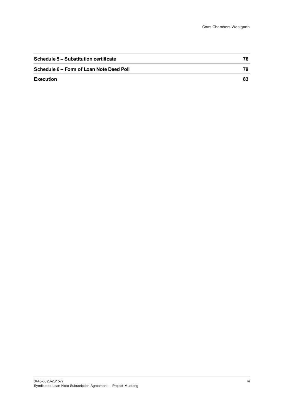 Corrs Chambers Westgarth 3445-6323-2315v7 vi Syndicated Loan Note Subscription Agreement – Project Mustang Schedule 5 – Substitution certificate 76 Schedule 6 – Form of Loan Note Deed Poll 79 Execution 83