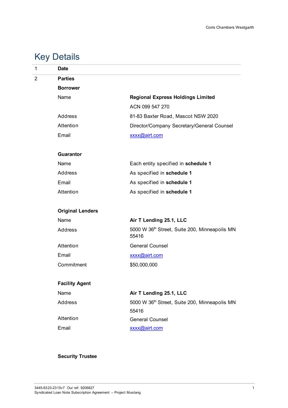 Corrs Chambers Westgarth 3445-6323-2315v7 Our ref: 9206827 1 Syndicated Loan Note Subscription Agreement – Project Mustang Key Details 1 Date 2 Parties Borrower Name Address Attention Email Guarantor Name Address Email Attention Original Lenders Name Address Attention Email Commitment Facility Agent Name Address Attention Email Regional Express Holdings Limited ACN 099 547 270 81-83 Baxter Road, Mascot NSW 2020 Director/Company Secretary/General Counsel xxxx@airt.com Each entity specif ied in schedule 1 As specif ied in schedule 1 As specif ied in schedule 1 As specif ied in schedule 1 Air T Lending 25.1, LLC 5000 W 36th Street, Suite 200, Minneapolis MN 55416 General Counsel xxxx@airt.com $50,000,000 Air T Lending 25.1, LLC 5000 W 36th Street, Suite 200, Minneapolis MN 55416 General Counsel xxxx@airt.com Security Trustee