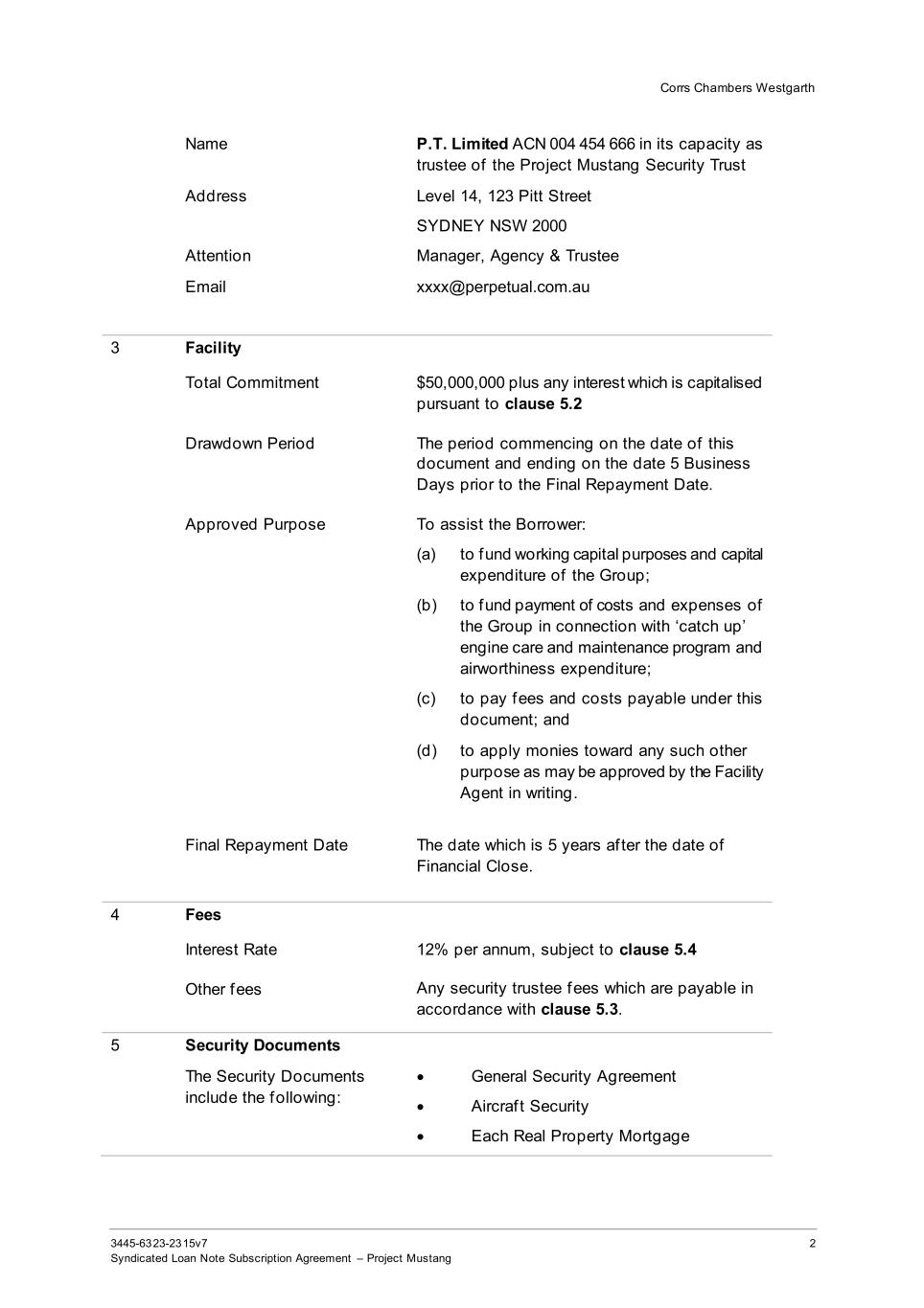 Corrs Chambers Westgarth 3445-6323-2315v7 2 Syndicated Loan Note Subscription Agreement – Project Mustang Name Address Attention Email P.T. Limited ACN 004 454 666 in its capacity as trustee of the Project Mustang Security Trust Level 14, 123 Pitt Street SYDNEY NSW 2000 Manager, Agency & Trustee xxxx@perpetual.com.au 3 Facility Total Commitment $50,000,000 plus any interest which is capitalised pursuant to clause 5.2 Drawdown Period The period commencing on the date of this document and ending on the date 5 Business Days prior to the Final Repayment Date. Approved Purpose To assist the Borrower: (a) to fund working capital purposes and capital expenditure of the Group; (b) to fund payment of costs and expenses of the Group in connection with ‘catch up’ engine care and maintenance program and airworthiness expenditure; (c) to pay fees and costs payable under this document; and (d) to apply monies toward any such other purpose as may be approved by the Facility Agent in writing. Final Repayment Date The date which is 5 years af ter the date of Financial Close. 4 Fees Interest Rate 12% per annum, subject to clause 5.4 Other fees Any security trustee fees which are payable in accordance with clause 5.3. 5 Security Documents The Security Documents include the following: • General Security Agreement • Aircraf t Security • Each Real Property Mortgage