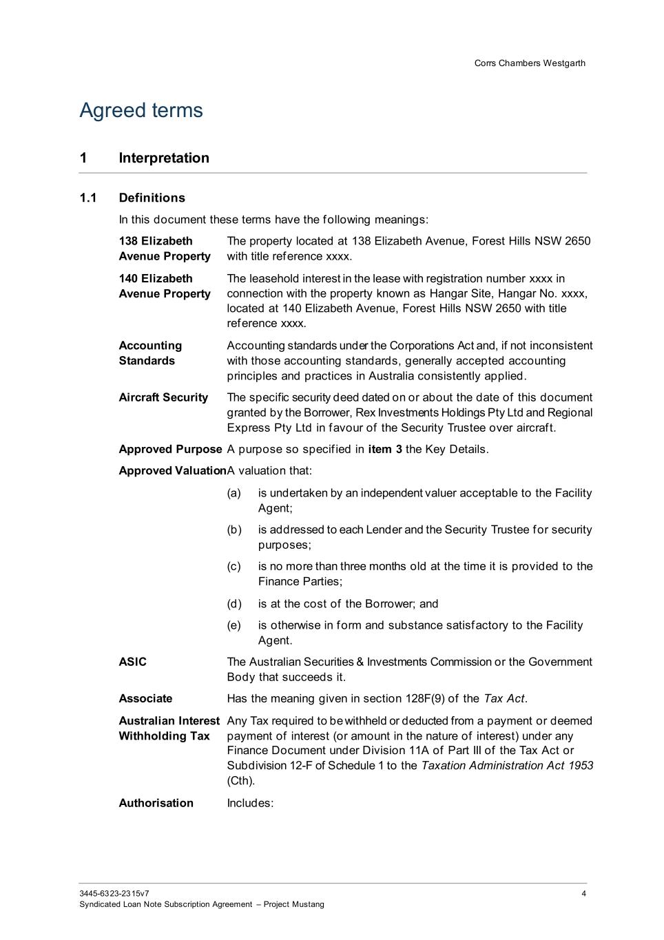 Corrs Chambers Westgarth 3445-6323-2315v7 4 Syndicated Loan Note Subscription Agreement – Project Mustang Agreed terms 1 Interpretation 1.1 Definitions In this document these terms have the following meanings: 138 Elizabeth Avenue Property 140 Elizabeth Avenue Property Accounting Standards Aircraft Security The property located at 138 Elizabeth Avenue, Forest Hills NSW 2650 with title reference xxxx. The leasehold interest in the lease with registration number xxxx in connection with the property known as Hangar Site, Hangar No. xxxx, located at 140 Elizabeth Avenue, Forest Hills NSW 2650 with title reference xxxx. Accounting standards under the Corporations Act and, if not inconsistent with those accounting standards, generally accepted accounting principles and practices in Australia consistently applied. The specific security deed dated on or about the date of this document granted by the Borrower, Rex Investments Holdings Pty Ltd and Regional Express Pty Ltd in favour of the Security Trustee over aircraf t. Approved Purpose A purpose so specif ied in item 3 the Key Details. Approved Valuation A valuation that: (a) is undertaken by an independent valuer acceptable to the Facility Agent; (b) is addressed to each Lender and the Security Trustee for security purposes; (c) is no more than three months old at the time it is provided to the Finance Parties; (d) is at the cost of the Borrower; and (e) is otherwise in form and substance satisfactory to the Facility Agent. ASIC The Australian Securities & Investments Commission or the Government Body that succeeds it. Associate Has the meaning given in section 128F(9) of the Tax Act. Australian Interest Withholding Tax Any Tax required to be withheld or deducted from a payment or deemed payment of interest (or amount in the nature of interest) under any Finance Document under Division 11A of Part III of the Tax Act or Subdivision 12-F of Schedule 1 to the Taxation Administration Act 1953 (Cth). Authorisation Includes: