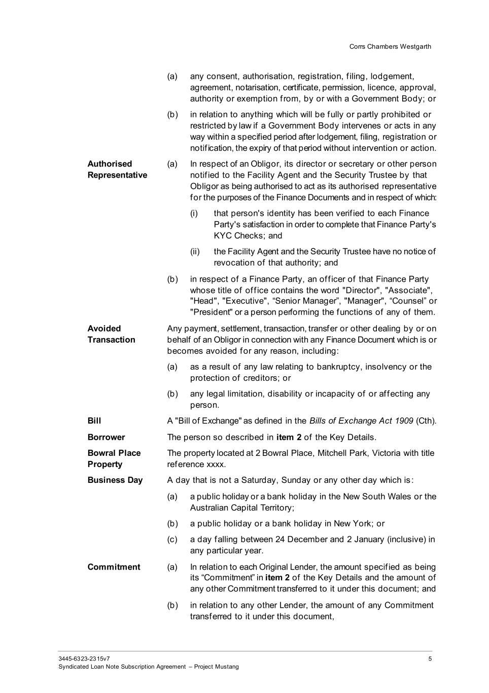 Corrs Chambers Westgarth 3445-6323-2315v7 5 Syndicated Loan Note Subscription Agreement – Project Mustang (a) any consent, authorisation, registration, f iling, lodgement, agreement, notarisation, certificate, permission, licence, approval, authority or exemption f rom, by or with a Government Body; or (b) in relation to anything which will be fully or partly prohibited or restricted by law if a Government Body intervenes or acts in any way within a specified period after lodgement, filing, registration or notif ication, the expiry of that period without intervention or action. Authorised Representative (a) In respect of an Obligor, its director or secretary or other person notif ied to the Facility Agent and the Security Trustee by that Obligor as being authorised to act as its authorised representative for the purposes of the Finance Documents and in respect of which: (i) that person's identity has been verif ied to each Finance Party's satisfaction in order to complete that Finance Party's KYC Checks; and (ii) the Facility Agent and the Security Trustee have no notice of revocation of that authority; and (b) in respect of a Finance Party, an of f icer of that Finance Party whose title of of f ice contains the word "Director", "Associate", "Head", "Executive", “Senior Manager”, "Manager", “Counsel” or "President" or a person performing the functions of any of them. Avoided Transaction Any payment, settlement, transaction, transfer or other dealing by or on behalf of an Obligor in connection with any Finance Document which is or becomes avoided for any reason, including: (a) as a result of any law relating to bankruptcy, insolvency or the protection of creditors; or (b) any legal limitation, disability or incapacity of or af fecting any person. Bill Borrower Bowral Place Property Business Day A "Bill of Exchange" as defined in the Bills of Exchange Act 1909 (Cth). The person so described in item 2 of the Key Details. The property located at 2 Bowral Place, Mitchell Park, Victoria with title reference xxxx. A day that is not a Saturday, Sunday or any other day which is : (a) a public holiday or a bank holiday in the New South Wales or the Australian Capital Territory; (b) a public holiday or a bank holiday in New York; or (c) a day falling between 24 December and 2 January (inclusive) in any particular year. Commitment (a) In relation to each Original Lender, the amount specif ied as being its “Commitment” in item 2 of the Key Details and the amount of any other Commitment transferred to it under this document; and (b) in relation to any other Lender, the amount of any Commitment transferred to it under this document,