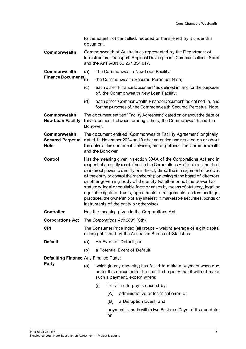 Corrs Chambers Westgarth 3445-6323-2315v7 6 Syndicated Loan Note Subscription Agreement – Project Mustang to the extent not cancelled, reduced or transferred by it under this document. Commonwealth Commonwealth of Australia as represented by the Department of Inf rastructure, Transport, Regional Development, Communications, Sport and the Arts ABN 86 267 354 017. Commonwealth Finance Documents (a) The Commonwealth New Loan Facility; (b) the Commonwealth Secured Perpetual Note; (c) each other “Finance Document” as defined in, and for the purposes of , the Commonwealth New Loan Facility; (d) each other “Commonwealth Finance Document” as defined in, and for the purposes of, the Commonwealth Secured Perpetual Note. Commonwealth New Loan Facility The document entitled “Facility Agreement” dated on or about the date of this document between, among others, the Commonwealth and the Borrower. Commonwealth Secured Perpetual Note The document entitled “Commonwealth Facility Agreement” originally dated 11 November 2024 and further amended and restated on or about the date of this document between, among others, the Commonwealth and the Borrower. Control Has the meaning given in section 50AA of the Corporations Act and in respect of an entity (as defined in the Corporations Act) includes the direct or indirect power to directly or indirectly direct the management or policies of the entity or control the membership or voting of the board of directors or other governing body of the entity (whether or not the power has statutory, legal or equitable force or arises by means of statutory, legal or equitable rights or trusts, agreements, arrangements, understandings, practices, the ownership of any interest in marketable securities, bonds or instruments of the entity or otherwise). Controller Has the meaning given in the Corporations Act. Corporations Act The Corporations Act 2001 (Cth). CPI The Consumer Price Index (all groups – weight average of eight capital cities) published by the Australian Bureau of Statistics. Default (a) An Event of Default; or (b) a Potential Event of Default. Defaulting Finance Party Any Finance Party: (a) which (in any capacity) has failed to make a payment when due under this document or has notif ied a party that it will not make such a payment, except where: (i) its failure to pay is caused by: (A) administrative or technical error; or (B) a Disruption Event; and payment is made within two Business Days of its due date; or