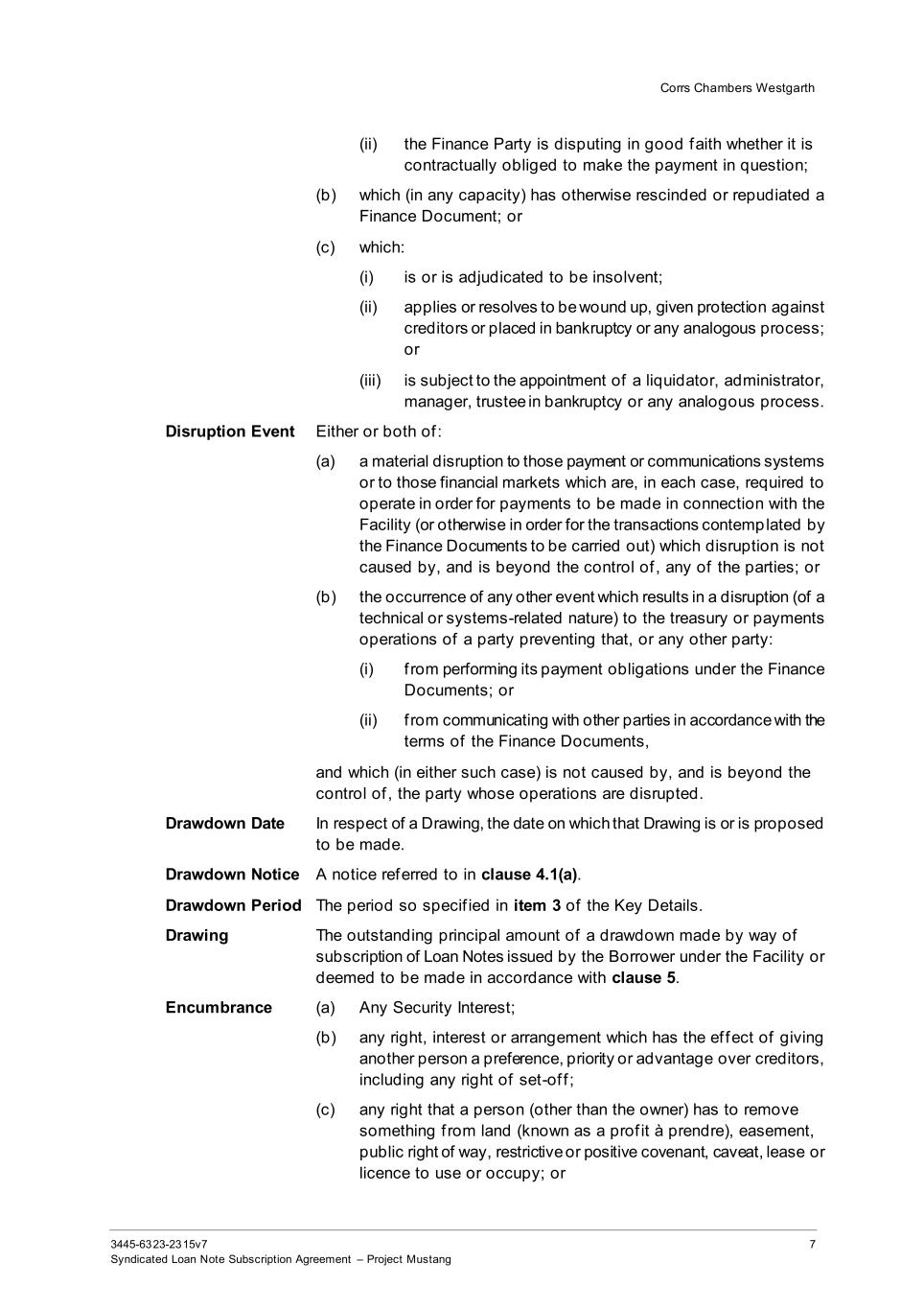 Corrs Chambers Westgarth 3445-6323-2315v7 7 Syndicated Loan Note Subscription Agreement – Project Mustang (ii) the Finance Party is disputing in good faith whether it is contractually obliged to make the payment in question; (b) which (in any capacity) has otherwise rescinded or repudiated a Finance Document; or (c) which: (i) is or is adjudicated to be insolvent; (ii) applies or resolves to be wound up, given protection against creditors or placed in bankruptcy or any analogous process; or (iii) is subject to the appointment of a liquidator, administrator, manager, trustee in bankruptcy or any analogous process. Disruption Event Either or both of : (a) a material disruption to those payment or communications systems or to those financial markets which are, in each case, required to operate in order for payments to be made in connection with the Facility (or otherwise in order for the transactions contemplated by the Finance Documents to be carried out) which disruption is not caused by, and is beyond the control of , any of the parties; or (b) the occurrence of any other event which results in a disruption (of a technical or systems-related nature) to the treasury or payments operations of a party preventing that, or any other party: (i) f rom performing its payment obligations under the Finance Documents; or (ii) f rom communicating with other parties in accordance with the terms of the Finance Documents, and which (in either such case) is not caused by, and is beyond the control of , the party whose operations are disrupted. Drawdown Date In respect of a Drawing, the date on which that Drawing is or is proposed to be made. Drawdown Notice A notice referred to in clause 4.1(a). Drawdown Period The period so specif ied in item 3 of the Key Details. Drawing The outstanding principal amount of a drawdown made by way of subscription of Loan Notes issued by the Borrower under the Facility or deemed to be made in accordance with clause 5. Encumbrance (a) Any Security Interest; (b) any right, interest or arrangement which has the ef fect of giving another person a preference, priority or advantage over creditors, including any right of set-of f ; (c) any right that a person (other than the owner) has to remove something f rom land (known as a prof it à prendre), easement, public right of way, restrictive or positive covenant, caveat, lease or licence to use or occupy; or