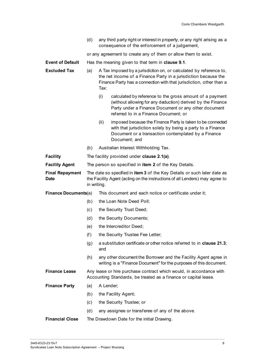 Corrs Chambers Westgarth 3445-6323-2315v7 8 Syndicated Loan Note Subscription Agreement – Project Mustang (d) any third party right or interest in property, or any right arising as a consequence of the enforcement of a judgement, or any agreement to create any of them or allow them to exist. Event of Default Has the meaning given to that term in clause 9.1. Excluded Tax (a) A Tax imposed by a jurisdiction on, or calculated by reference to, the net income of a Finance Party in a jurisdiction because the Finance Party has a connection with that jurisdiction, other than a Tax: (i) calculated by reference to the gross amount of a payment (without allowing for any deduction) derived by the Finance Party under a Finance Document or any other document referred to in a Finance Document; or (ii) imposed because the Finance Party is taken to be connected with that jurisdiction solely by being a party to a Finance Document or a transaction contemplated by a Finance Document; and (b) Australian Interest Withholding Tax. Facility The facility provided under clause 2.1(a). Facility Agent The person so specif ied in item 2 of the Key Details. Final Repayment Date The date so specified in item 3 of the Key Details or such later date as the Facility Agent (acting on the instructions of all Lenders) may agree to in writing. Finance Documents (a) This document and each notice or certif icate under it; (b) the Loan Note Deed Poll; (c) the Security Trust Deed; (d) the Security Documents; (e) the Intercreditor Deed; (f ) the Security Trustee Fee Letter; (g) a substitution certificate or other notice referred to in clause 21.3; and (h) any other document the Borrower and the Facility Agent agree in writing is a "Finance Document" for the purposes of this document. Finance Lease Any lease or hire purchase contract which would, in accordance with Accounting Standards, be treated as a f inance or capital lease. Finance Party (a) A Lender; (b) the Facility Agent; (c) the Security Trustee; or (d) any assignee or transferee of any of the above. Financial Close The Drawdown Date for the initial Drawing.