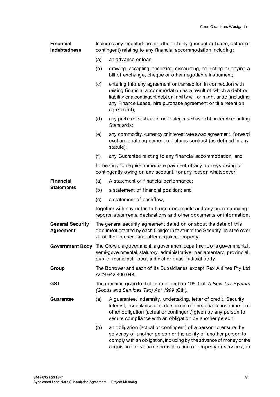 Corrs Chambers Westgarth 3445-6323-2315v7 9 Syndicated Loan Note Subscription Agreement – Project Mustang Financial Indebtedness Includes any indebtedness or other liability (present or future, actual or contingent) relating to any f inancial accommodation including: (a) an advance or loan; (b) drawing, accepting, endorsing, discounting, collecting or paying a bill of exchange, cheque or other negotiable instrument; (c) entering into any agreement or transaction in connection with raising f inancial accommodation as a result of which a debt or liability or a contingent debt or liability will or might arise (including any Finance Lease, hire purchase agreement or title retention agreement); (d) any preference share or unit categorised as debt under Accounting Standards; (e) any commodity, currency or interest rate swap agreement, forward exchange rate agreement or futures contract (as def ined in any statute); (f ) any Guarantee relating to any f inancial accommodation; and forbearing to require immediate payment of any moneys owing or contingently owing on any account, for any reason whatsoever. Financial Statements (a) A statement of f inancial performance; (b) a statement of f inancial position; and (c) a statement of cashf low, together with any notes to those documents and any accompanying reports, statements, declarations and other documents or information. General Security Agreement The general security agreement dated on or about the date of this document granted by each Obligor in favour of the Security Trustee over all of their present and af ter acquired property. Government Body The Crown, a government, a government department, or a governmental, semi-governmental, statutory, administrative, parliamentary, provincial, public, municipal, local, judicial or quasi-judicial body. Group The Borrower and each of its Subsidiaries except Rex Airlines Pty Ltd ACN 642 400 048. GST The meaning given to that term in section 195-1 of A New Tax System (Goods and Services Tax) Act 1999 (Cth). Guarantee (a) A guarantee, indemnity, undertaking, letter of credit, Security Interest, acceptance or endorsement of a negotiable instrument or other obligation (actual or contingent) given by any person to secure compliance with an obligation by another person; (b) an obligation (actual or contingent) of a person to ensure the solvency of another person or the ability of another person to comply with an obligation, including by the advance of money or the acquisition for valuable consideration of property or services ; or