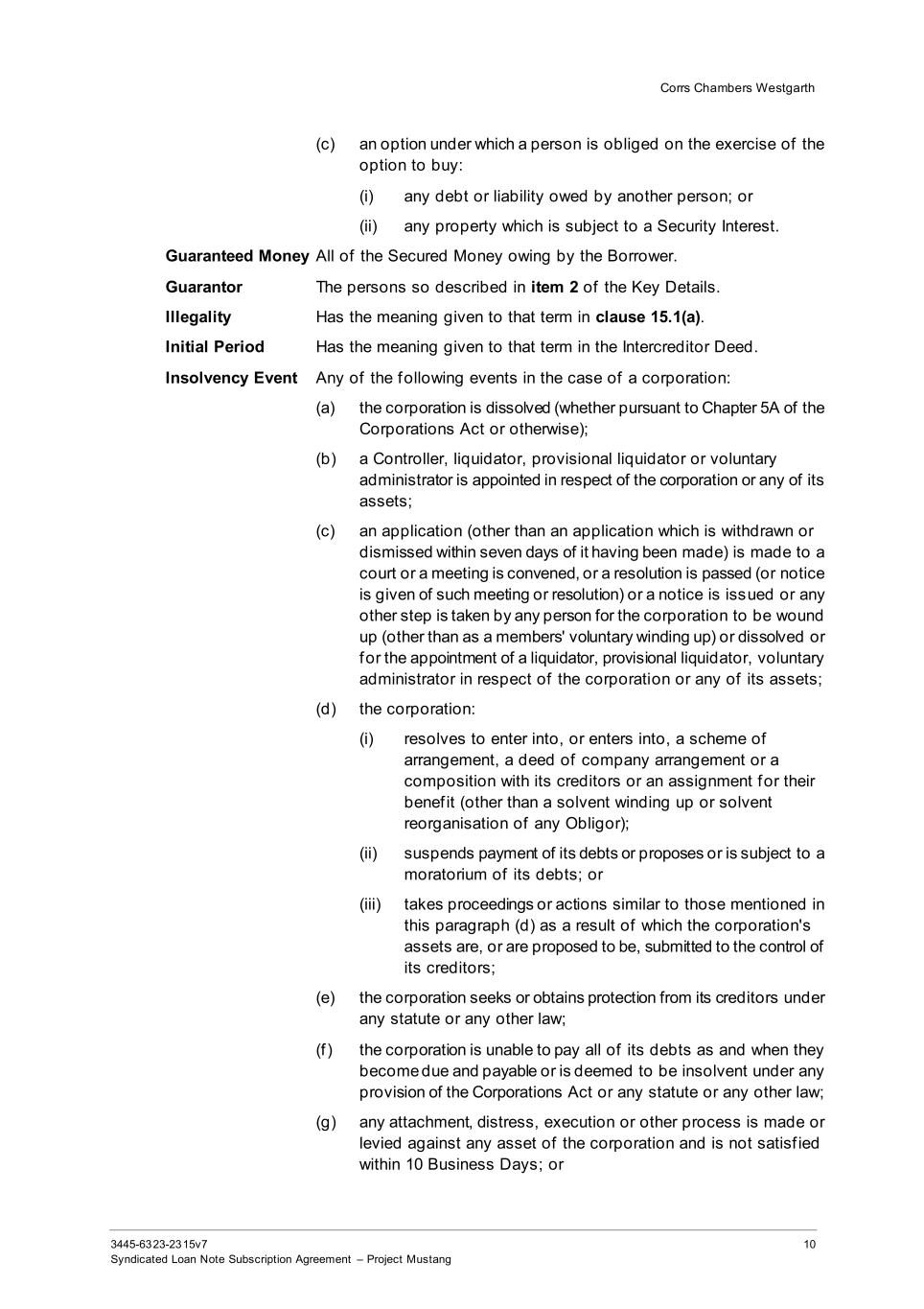 Corrs Chambers Westgarth 3445-6323-2315v7 10 Syndicated Loan Note Subscription Agreement – Project Mustang (c) an option under which a person is obliged on the exercise of the option to buy: (i) any debt or liability owed by another person; or (ii) any property which is subject to a Security Interest. Guaranteed Money All of the Secured Money owing by the Borrower. Guarantor The persons so described in item 2 of the Key Details. Illegality Has the meaning given to that term in clause 15.1(a). Initial Period Has the meaning given to that term in the Intercreditor Deed. Insolvency Event Any of the following events in the case of a corporation: (a) the corporation is dissolved (whether pursuant to Chapter 5A of the Corporations Act or otherwise); (b) a Controller, liquidator, provisional liquidator or voluntary administrator is appointed in respect of the corporation or any of its assets; (c) an application (other than an application which is withdrawn or dismissed within seven days of it having been made) is made to a court or a meeting is convened, or a resolution is passed (or notice is given of such meeting or resolution) or a notice is issued or any other step is taken by any person for the corporation to be wound up (other than as a members' voluntary winding up) or dissolved or for the appointment of a liquidator, provisional liquidator, voluntary administrator in respect of the corporation or any of its assets; (d) the corporation: (i) resolves to enter into, or enters into, a scheme of arrangement, a deed of company arrangement or a composition with its creditors or an assignment for their benef it (other than a solvent winding up or solvent reorganisation of any Obligor); (ii) suspends payment of its debts or proposes or is subject to a moratorium of its debts; or (iii) takes proceedings or actions similar to those mentioned in this paragraph (d) as a result of which the corporation's assets are, or are proposed to be, submitted to the control of its creditors; (e) the corporation seeks or obtains protection from its creditors under any statute or any other law; (f ) the corporation is unable to pay all of its debts as and when they become due and payable or is deemed to be insolvent under any provision of the Corporations Act or any statute or any other law; (g) any attachment, distress, execution or other process is made or levied against any asset of the corporation and is not satisf ied within 10 Business Days; or