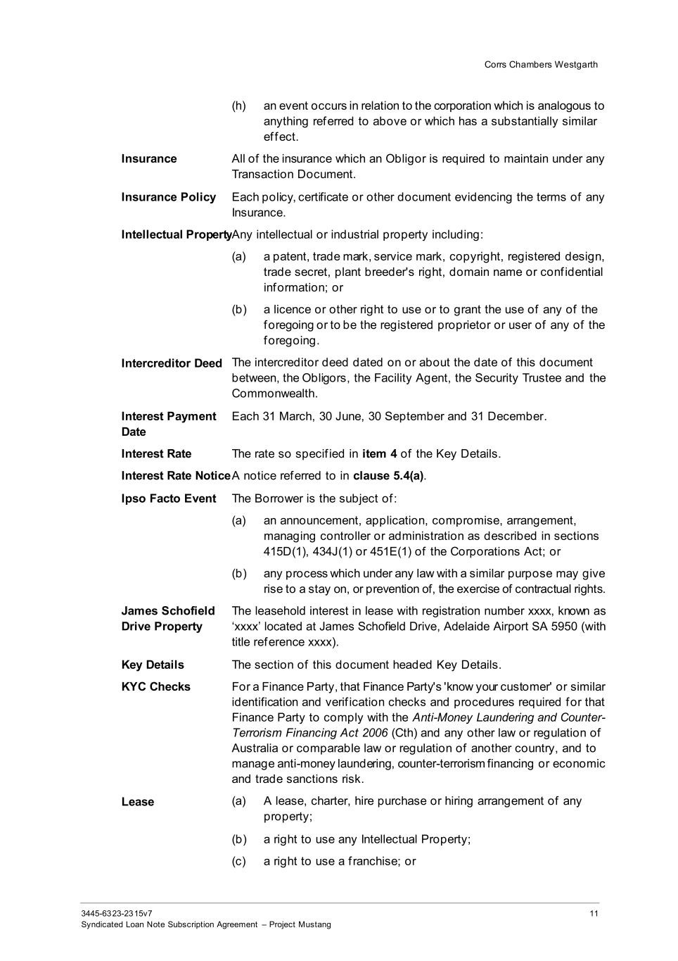Corrs Chambers Westgarth 3445-6323-2315v7 11 Syndicated Loan Note Subscription Agreement – Project Mustang (h) an event occurs in relation to the corporation which is analogous to anything referred to above or which has a substantially similar ef fect. Insurance All of the insurance which an Obligor is required to maintain under any Transaction Document. Insurance Policy Each policy, certificate or other document evidencing the terms of any Insurance. Intellectual Property Any intellectual or industrial property including: (a) a patent, trade mark, service mark, copyright, registered design, trade secret, plant breeder's right, domain name or conf idential information; or (b) a licence or other right to use or to grant the use of any of the foregoing or to be the registered proprietor or user of any of the foregoing. Intercreditor Deed The intercreditor deed dated on or about the date of this document between, the Obligors, the Facility Agent, the Security Trustee and the Commonwealth. Interest Payment Date Each 31 March, 30 June, 30 September and 31 December. Interest Rate The rate so specif ied in item 4 of the Key Details. Interest Rate Notice A notice referred to in clause 5.4(a). Ipso Facto Event The Borrower is the subject of : (a) an announcement, application, compromise, arrangement, managing controller or administration as described in sections 415D(1), 434J(1) or 451E(1) of the Corporations Act; or (b) any process which under any law with a similar purpose may give rise to a stay on, or prevention of, the exercise of contractual rights. James Schofield Drive Property Key Details KYC Checks The leasehold interest in lease with registration number xxxx, known as ‘xxxx’ located at James Schofield Drive, Adelaide Airport SA 5950 (with title reference xxxx). The section of this document headed Key Details. For a Finance Party, that Finance Party's 'know your customer' or similar identification and verif ication checks and procedures required for that Finance Party to comply with the Anti-Money Laundering and Counter- Terrorism Financing Act 2006 (Cth) and any other law or regulation of Australia or comparable law or regulation of another country, and to manage anti-money laundering, counter-terrorism financing or economic and trade sanctions risk. Lease (a) A lease, charter, hire purchase or hiring arrangement of any property; (b) a right to use any Intellectual Property; (c) a right to use a f ranchise; or