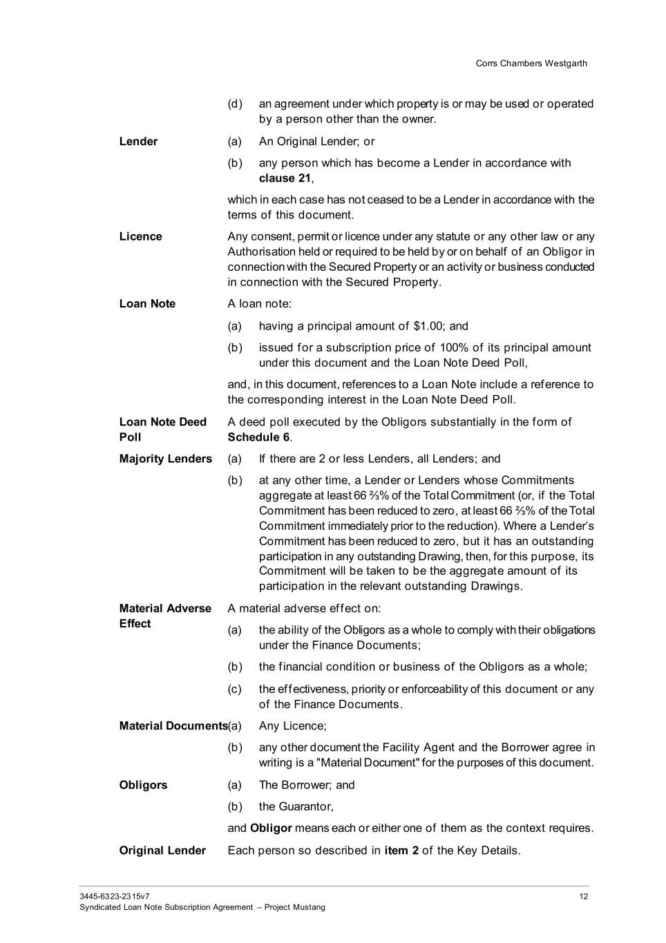 Corrs Chambers Westgarth 3445-6323-2315v7 12 Syndicated Loan Note Subscription Agreement – Project Mustang (d) an agreement under which property is or may be used or operated by a person other than the owner. Lender (a) An Original Lender; or (b) any person which has become a Lender in accordance with clause 21, which in each case has not ceased to be a Lender in accordance with the terms of this document. Licence Any consent, permit or licence under any statute or any other law or any Authorisation held or required to be held by or on behalf of an Obligor in connection with the Secured Property or an activity or business conducted in connection with the Secured Property. Loan Note A loan note: (a) having a principal amount of $1.00; and (b) issued for a subscription price of 100% of its principal amount under this document and the Loan Note Deed Poll, and, in this document, references to a Loan Note include a reference to the corresponding interest in the Loan Note Deed Poll. Loan Note Deed Poll A deed poll executed by the Obligors substantially in the form of Schedule 6. Majority Lenders (a) If there are 2 or less Lenders, all Lenders; and (b) at any other time, a Lender or Lenders whose Commitments aggregate at least 66 ⅔% of the Total Commitment (or, if the Total Commitment has been reduced to zero, at least 66 ⅔% of the Total Commitment immediately prior to the reduction). Where a Lender’s Commitment has been reduced to zero, but it has an outstanding participation in any outstanding Drawing, then, for this purpose, its Commitment will be taken to be the aggregate amount of its participation in the relevant outstanding Drawings. Material Adverse Effect A material adverse ef fect on: (a) the ability of the Obligors as a whole to comply with their obligations under the Finance Documents; (b) the f inancial condition or business of the Obligors as a whole; (c) the ef fectiveness, priority or enforceability of this document or any of the Finance Documents. Material Documents (a) Any Licence; (b) any other document the Facility Agent and the Borrower agree in writing is a "Material Document" for the purposes of this document. Obligors (a) The Borrower; and (b) the Guarantor, and Obligor means each or either one of them as the context requires. Original Lender Each person so described in item 2 of the Key Details.