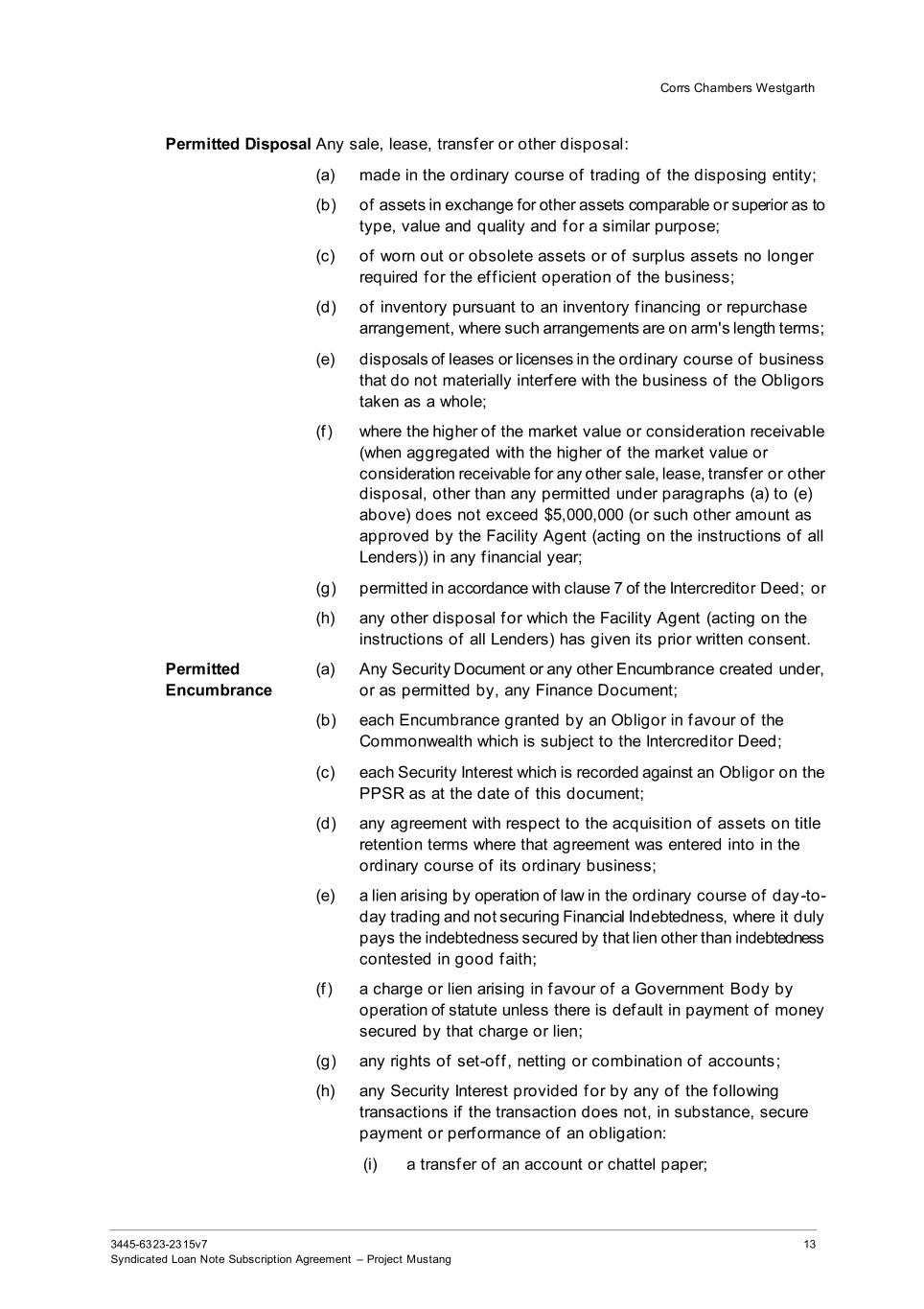 Corrs Chambers Westgarth 3445-6323-2315v7 13 Syndicated Loan Note Subscription Agreement – Project Mustang Permitted Disposal Any sale, lease, transfer or other disposal: (a) made in the ordinary course of trading of the disposing entity; (b) of assets in exchange for other assets comparable or superior as to type, value and quality and for a similar purpose; (c) of worn out or obsolete assets or of surplus assets no longer required for the ef f icient operation of the business; (d) of inventory pursuant to an inventory f inancing or repurchase arrangement, where such arrangements are on arm's length terms; (e) disposals of leases or licenses in the ordinary course of business that do not materially interfere with the business of the Obligors taken as a whole; (f ) where the higher of the market value or consideration receivable (when aggregated with the higher of the market value or consideration receivable for any other sale, lease, transfer or other disposal, other than any permitted under paragraphs (a) to (e) above) does not exceed $5,000,000 (or such other amount as approved by the Facility Agent (acting on the instructions of all Lenders)) in any f inancial year; (g) permitted in accordance with clause 7 of the Intercreditor Deed; or (h) any other disposal for which the Facility Agent (acting on the instructions of all Lenders) has given its prior written consent. Permitted Encumbrance (a) Any Security Document or any other Encumbrance created under, or as permitted by, any Finance Document; (b) each Encumbrance granted by an Obligor in favour of the Commonwealth which is subject to the Intercreditor Deed; (c) each Security Interest which is recorded against an Obligor on the PPSR as at the date of this document; (d) any agreement with respect to the acquisition of assets on title retention terms where that agreement was entered into in the ordinary course of its ordinary business; (e) a lien arising by operation of law in the ordinary course of day-to- day trading and not securing Financial Indebtedness, where it duly pays the indebtedness secured by that lien other than indebtedness contested in good faith; (f ) a charge or lien arising in favour of a Government Body by operation of statute unless there is default in payment of money secured by that charge or lien; (g) any rights of set-of f , netting or combination of accounts; (h) any Security Interest provided for by any of the following transactions if the transaction does not, in substance, secure payment or performance of an obligation: (i) a transfer of an account or chattel paper;