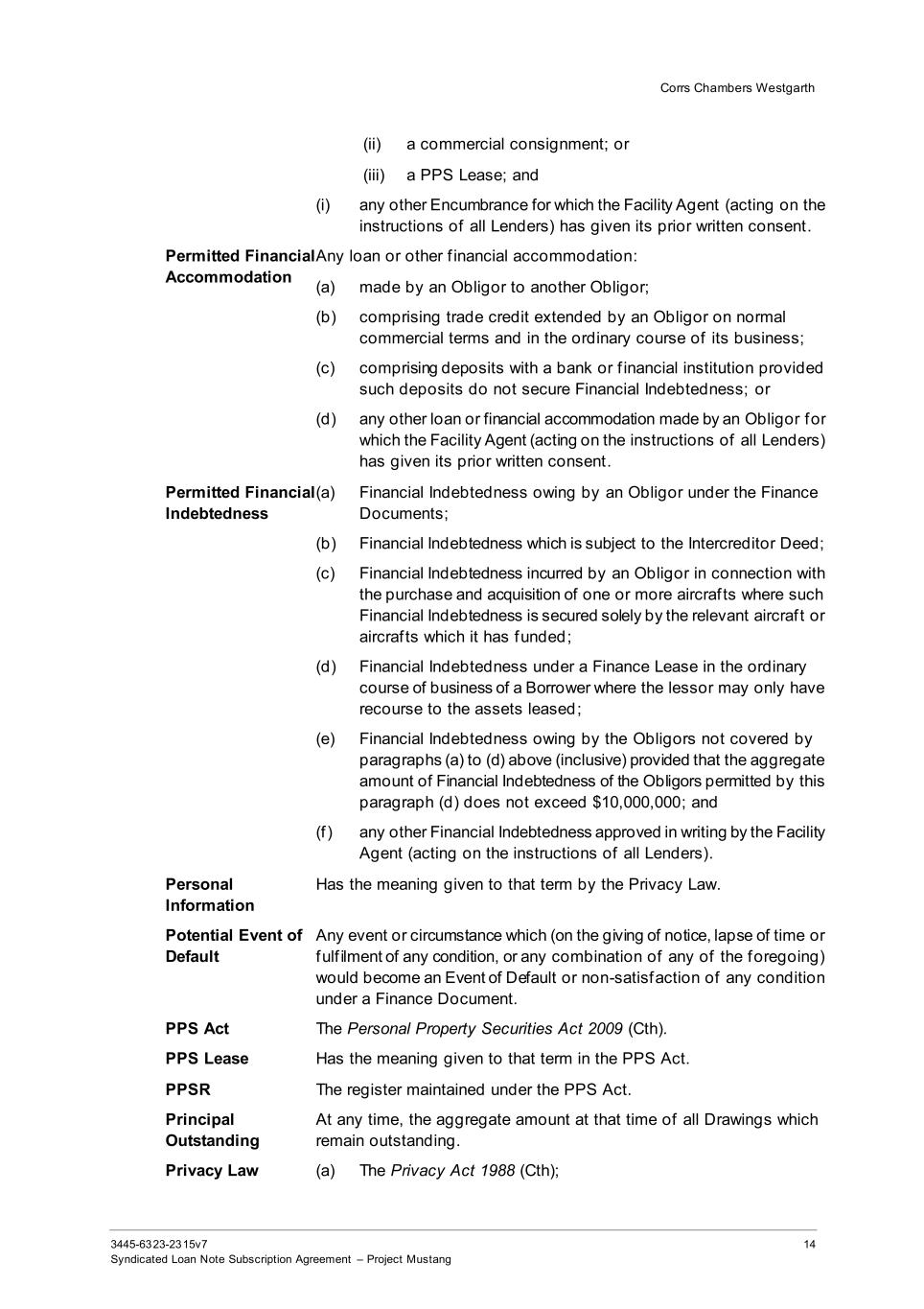 Corrs Chambers Westgarth 3445-6323-2315v7 14 Syndicated Loan Note Subscription Agreement – Project Mustang (ii) a commercial consignment; or (iii) a PPS Lease; and (i) any other Encumbrance for which the Facility Agent (acting on the instructions of all Lenders) has given its prior written consent. Permitted Financial Accommodation Any loan or other f inancial accommodation: (a) made by an Obligor to another Obligor; (b) comprising trade credit extended by an Obligor on normal commercial terms and in the ordinary course of its business; (c) comprising deposits with a bank or f inancial institution provided such deposits do not secure Financial Indebtedness; or (d) any other loan or financial accommodation made by an Obligor for which the Facility Agent (acting on the instructions of all Lenders) has given its prior written consent. Permitted Financial Indebtedness (a) Financial Indebtedness owing by an Obligor under the Finance Documents; (b) Financial Indebtedness which is subject to the Intercreditor Deed; (c) Financial Indebtedness incurred by an Obligor in connection with the purchase and acquisition of one or more aircraf ts where such Financial Indebtedness is secured solely by the relevant aircraf t or aircraf ts which it has funded; (d) Financial Indebtedness under a Finance Lease in the ordinary course of business of a Borrower where the lessor may only have recourse to the assets leased; (e) Financial Indebtedness owing by the Obligors not covered by paragraphs (a) to (d) above (inclusive) provided that the aggregate amount of Financial Indebtedness of the Obligors permitted by this paragraph (d) does not exceed $10,000,000; and (f ) any other Financial Indebtedness approved in writing by the Facility Agent (acting on the instructions of all Lenders). Personal Information Has the meaning given to that term by the Privacy Law. Potential Event of Default Any event or circumstance which (on the giving of notice, lapse of time or fulf ilment of any condition, or any combination of any of the foregoing) would become an Event of Default or non-satisfaction of any condition under a Finance Document. PPS Act The Personal Property Securities Act 2009 (Cth). PPS Lease Has the meaning given to that term in the PPS Act. PPSR The register maintained under the PPS Act. Principal Outstanding At any time, the aggregate amount at that time of all Drawings which remain outstanding. Privacy Law (a) The Privacy Act 1988 (Cth);