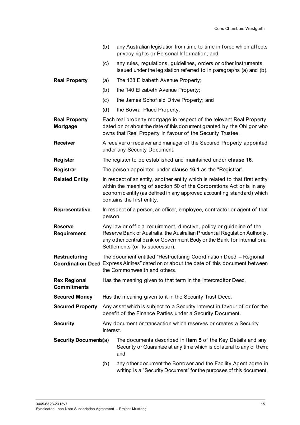 Corrs Chambers Westgarth 3445-6323-2315v7 15 Syndicated Loan Note Subscription Agreement – Project Mustang (b) any Australian legislation from time to time in force which af fects privacy rights or Personal Information; and (c) any rules, regulations, guidelines, orders or other instruments issued under the legislation referred to in paragraphs (a) and (b). Real Property (a) The 138 Elizabeth Avenue Property; (b) the 140 Elizabeth Avenue Property; (c) the James Schof ield Drive Property; and (d) the Bowral Place Property. Real Property Mortgage Each real property mortgage in respect of the relevant Real Property dated on or about the date of this document granted by the Obligor who owns that Real Property in favour of the Security Trustee. Receiver A receiver or receiver and manager of the Secured Property appointed under any Security Document. Register The register to be established and maintained under clause 16. Registrar The person appointed under clause 16.1 as the "Registrar". Related Entity In respect of an entity, another entity which is related to that f irst entity within the meaning of section 50 of the Corporations Act or is in any economic entity (as defined in any approved accounting standard) which contains the f irst entity. Representative In respect of a person, an officer, employee, contractor or agent of that person. Reserve Requirement Any law or of f icial requirement, directive, policy or guideline of the Reserve Bank of Australia, the Australian Prudential Regulation Authority, any other central bank or Government Body or the Bank for International Settlements (or its successor). Restructuring Coordination Deed The document entitled “Restructuring Coordination Deed – Regional Express Airlines” dated on or about the date of this document between the Commonwealth and others. Rex Regional Commitments Has the meaning given to that term in the Intercreditor Deed. Secured Money Has the meaning given to it in the Security Trust Deed. Secured Property Any asset which is subject to a Security Interest in favour of or for the benef it of the Finance Parties under a Security Document. Security Any document or transaction which reserves or creates a Security Interest. Security Documents (a) The documents described in item 5 of the Key Details and any Security or Guarantee at any time which is collateral to any of them; and (b) any other document the Borrower and the Facility Agent agree in writing is a "Security Document" for the purposes of this document.
