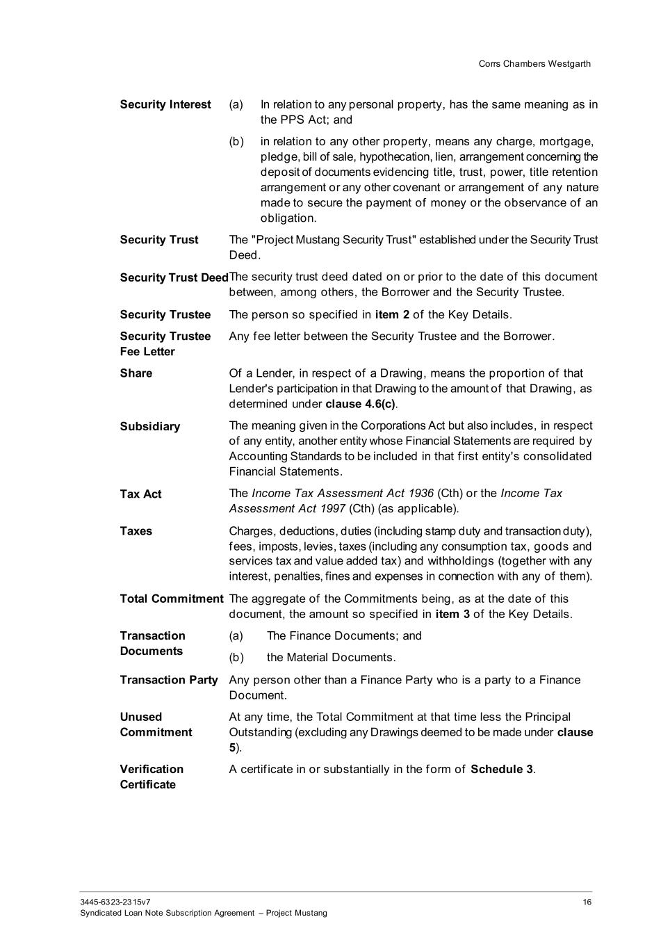 Corrs Chambers Westgarth 3445-6323-2315v7 16 Syndicated Loan Note Subscription Agreement – Project Mustang Security Interest (a) In relation to any personal property, has the same meaning as in the PPS Act; and (b) in relation to any other property, means any charge, mortgage, pledge, bill of sale, hypothecation, lien, arrangement concerning the deposit of documents evidencing title, trust, power, title retention arrangement or any other covenant or arrangement of any nature made to secure the payment of money or the observance of an obligation. Security Trust The "Project Mustang Security Trust" established under the Security Trust Deed. Security Trust Deed The security trust deed dated on or prior to the date of this document between, among others, the Borrower and the Security Trustee. Security Trustee The person so specif ied in item 2 of the Key Details. Security Trustee Fee Letter Any fee letter between the Security Trustee and the Borrower. Share Of a Lender, in respect of a Drawing, means the proportion of that Lender's participation in that Drawing to the amount of that Drawing, as determined under clause 4.6(c). Subsidiary The meaning given in the Corporations Act but also includes, in respect of any entity, another entity whose Financial Statements are required by Accounting Standards to be included in that f irst entity's consolidated Financial Statements. Tax Act The Income Tax Assessment Act 1936 (Cth) or the Income Tax Assessment Act 1997 (Cth) (as applicable). Taxes Charges, deductions, duties (including stamp duty and transaction duty), fees, imposts, levies, taxes (including any consumption tax, goods and services tax and value added tax) and withholdings (together with any interest, penalties, fines and expenses in connection with any of them). Total Commitment The aggregate of the Commitments being, as at the date of this document, the amount so specif ied in item 3 of the Key Details. Transaction Documents (a) The Finance Documents; and (b) the Material Documents. Transaction Party Any person other than a Finance Party who is a party to a Finance Document. Unused Commitment At any time, the Total Commitment at that time less the Principal Outstanding (excluding any Drawings deemed to be made under clause 5). Verification Certificate A certif icate in or substantially in the form of Schedule 3.