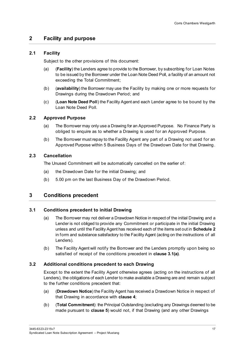 Corrs Chambers Westgarth 3445-6323-2315v7 17 Syndicated Loan Note Subscription Agreement – Project Mustang 2 Facility and purpose 2.1 Facility Subject to the other provisions of this document: (a) (Facility) the Lenders agree to provide to the Borrower, by subscribing for Loan Notes to be issued by the Borrower under the Loan Note Deed Poll, a facility of an amount not exceeding the Total Commitment; (b) (availability) the Borrower may use the Facility by making one or more requests for Drawings during the Drawdown Period; and (c) (Loan Note Deed Poll) the Facility Agent and each Lender agree to be bound by the Loan Note Deed Poll. 2.2 Approved Purpose (a) The Borrower may only use a Drawing for an Approved Purpose. No Finance Party is obliged to enquire as to whether a Drawing is used for an Approved Purpose. (b) The Borrower must repay to the Facility Agent any part of a Drawing not used for an Approved Purpose within 5 Business Days of the Drawdown Date for that Drawing . 2.3 Cancellation The Unused Commitment will be automatically cancelled on the earlier of : (a) the Drawdown Date for the initial Drawing; and (b) 5.00 pm on the last Business Day of the Drawdown Period. 3 Conditions precedent 3.1 Conditions precedent to initial Drawing (a) The Borrower may not deliver a Drawdown Notice in respect of the initial Drawing and a Lender is not obliged to provide any Commitment or participate in the initial Drawing unless and until the Facility Agent has received each of the items set out in Schedule 2 in form and substance satisfactory to the Facility Agent (acting on the instructions of all Lenders). (b) The Facility Agent will notify the Borrower and the Lenders promptly upon being so satisf ied of receipt of the conditions precedent in clause 3.1(a). 3.2 Additional conditions precedent to each Drawing Except to the extent the Facility Agent otherwise agrees (acting on the instructions of all Lenders), the obligations of each Lender to make available a Drawing are and remain subject to the further conditions precedent that: (a) (Drawdown Notice) the Facility Agent has received a Drawdown Notice in respect of that Drawing in accordance with clause 4; (b) (Total Commitment): the Principal Outstanding (excluding any Drawings deemed to be made pursuant to clause 5) would not, if that Drawing (and any other Drawings