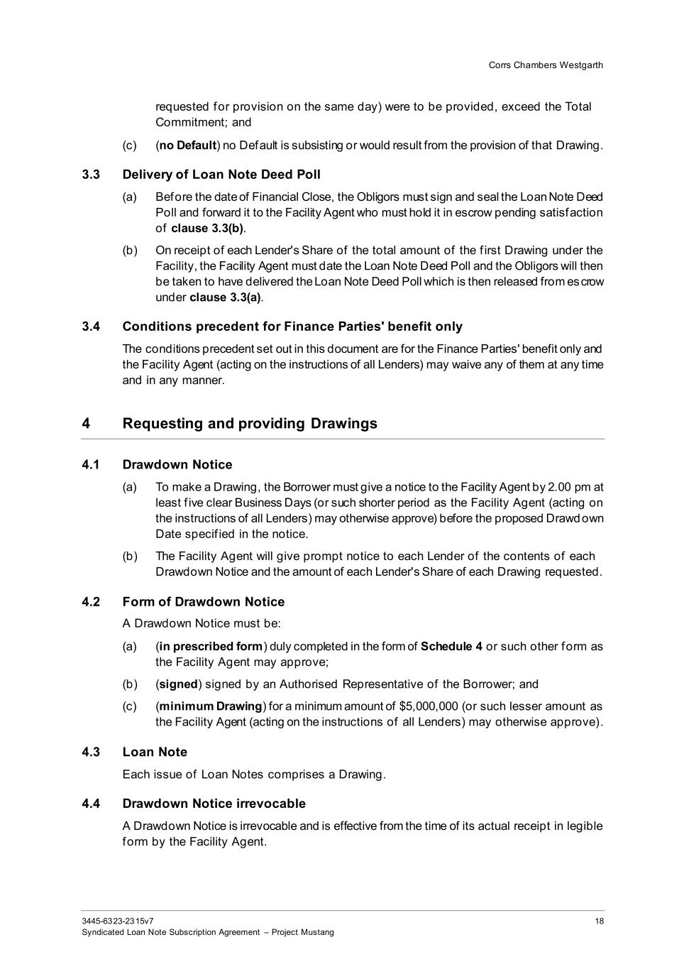 Corrs Chambers Westgarth 3445-6323-2315v7 18 Syndicated Loan Note Subscription Agreement – Project Mustang requested for provision on the same day) were to be provided, exceed the Total Commitment; and (c) (no Default) no Default is subsisting or would result from the provision of that Drawing. 3.3 Delivery of Loan Note Deed Poll (a) Before the date of Financial Close, the Obligors must sign and seal the Loan Note Deed Poll and forward it to the Facility Agent who must hold it in escrow pending satisfaction of clause 3.3(b). (b) On receipt of each Lender's Share of the total amount of the f irst Drawing under the Facility, the Facility Agent must date the Loan Note Deed Poll and the Obligors will then be taken to have delivered the Loan Note Deed Poll which is then released from escrow under clause 3.3(a). 3.4 Conditions precedent for Finance Parties' benefit only The conditions precedent set out in this document are for the Finance Parties' benefit only and the Facility Agent (acting on the instructions of all Lenders) may waive any of them at any time and in any manner. 4 Requesting and providing Drawings 4.1 Drawdown Notice (a) To make a Drawing, the Borrower must give a notice to the Facility Agent by 2.00 pm at least f ive clear Business Days (or such shorter period as the Facility Agent (acting on the instructions of all Lenders) may otherwise approve) before the proposed Drawdown Date specif ied in the notice. (b) The Facility Agent will give prompt notice to each Lender of the contents of each Drawdown Notice and the amount of each Lender's Share of each Drawing requested. 4.2 Form of Drawdown Notice A Drawdown Notice must be: (a) (in prescribed form) duly completed in the form of Schedule 4 or such other form as the Facility Agent may approve; (b) (signed) signed by an Authorised Representative of the Borrower; and (c) (minimum Drawing) for a minimum amount of $5,000,000 (or such lesser amount as the Facility Agent (acting on the instructions of all Lenders) may otherwise approve). 4.3 Loan Note Each issue of Loan Notes comprises a Drawing. 4.4 Drawdown Notice irrevocable A Drawdown Notice is irrevocable and is effective from the time of its actual receipt in legible form by the Facility Agent.