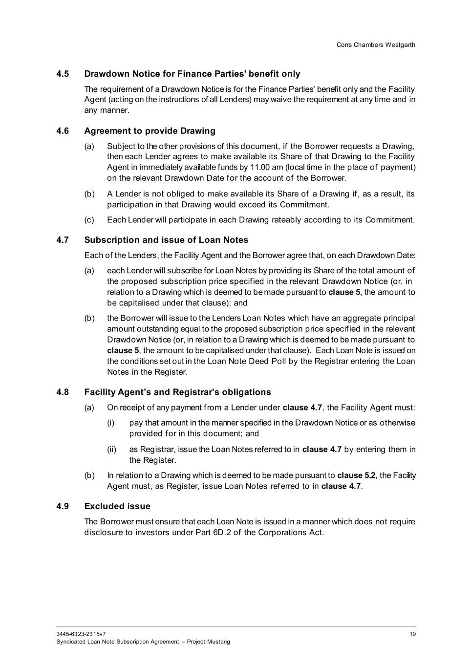 Corrs Chambers Westgarth 3445-6323-2315v7 19 Syndicated Loan Note Subscription Agreement – Project Mustang 4.5 Drawdown Notice for Finance Parties' benefit only The requirement of a Drawdown Notice is for the Finance Parties' benefit only and the Facility Agent (acting on the instructions of all Lenders) may waive the requirement at any time and in any manner. 4.6 Agreement to provide Drawing (a) Subject to the other provisions of this document, if the Borrower requests a Drawing, then each Lender agrees to make available its Share of that Drawing to the Facility Agent in immediately available funds by 11.00 am (local time in the place of payment) on the relevant Drawdown Date for the account of the Borrower. (b) A Lender is not obliged to make available its Share of a Drawing if , as a result, its participation in that Drawing would exceed its Commitment. (c) Each Lender will participate in each Drawing rateably according to its Commitment. 4.7 Subscription and issue of Loan Notes Each of the Lenders, the Facility Agent and the Borrower agree that, on each Drawdown Date: (a) each Lender will subscribe for Loan Notes by providing its Share of the total amount of the proposed subscription price specif ied in the relevant Drawdown Notice (or, in relation to a Drawing which is deemed to be made pursuant to clause 5, the amount to be capitalised under that clause); and (b) the Borrower will issue to the Lenders Loan Notes which have an aggregate principal amount outstanding equal to the proposed subscription price specif ied in the relevant Drawdown Notice (or, in relation to a Drawing which is deemed to be made pursuant to clause 5, the amount to be capitalised under that clause). Each Loan Note is issued on the conditions set out in the Loan Note Deed Poll by the Registrar entering the Loan Notes in the Register. 4.8 Facility Agent’s and Registrar’s obligations (a) On receipt of any payment f rom a Lender under clause 4.7, the Facility Agent must: (i) pay that amount in the manner specified in the Drawdown Notice or as otherwise provided for in this document; and (ii) as Registrar, issue the Loan Notes referred to in clause 4.7 by entering them in the Register. (b) In relation to a Drawing which is deemed to be made pursuant to clause 5.2, the Facility Agent must, as Register, issue Loan Notes referred to in clause 4.7. 4.9 Excluded issue The Borrower must ensure that each Loan Note is issued in a manner which does not require disclosure to investors under Part 6D.2 of the Corporations Act.