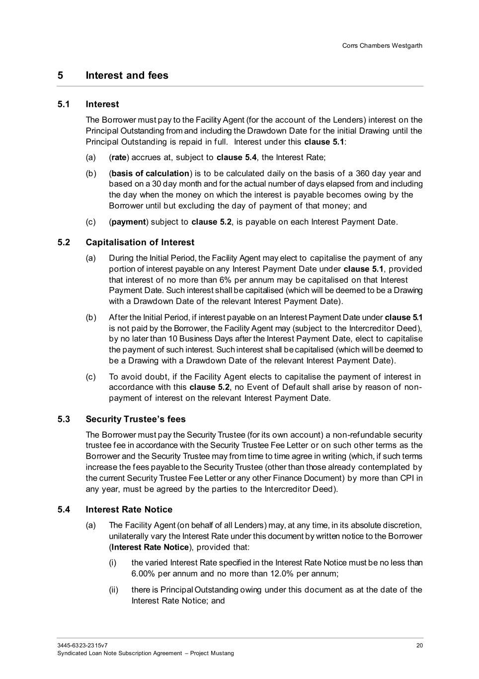 Corrs Chambers Westgarth 3445-6323-2315v7 20 Syndicated Loan Note Subscription Agreement – Project Mustang 5 Interest and fees 5.1 Interest The Borrower must pay to the Facility Agent (for the account of the Lenders) interest on the Principal Outstanding from and including the Drawdown Date for the initial Drawing until the Principal Outstanding is repaid in full. Interest under this clause 5.1: (a) (rate) accrues at, subject to clause 5.4, the Interest Rate; (b) (basis of calculation) is to be calculated daily on the basis of a 360 day year and based on a 30 day month and for the actual number of days elapsed from and including the day when the money on which the interest is payable becomes owing by the Borrower until but excluding the day of payment of that money; and (c) (payment) subject to clause 5.2, is payable on each Interest Payment Date. 5.2 Capitalisation of Interest (a) During the Initial Period, the Facility Agent may elect to capitalise the payment of any portion of interest payable on any Interest Payment Date under clause 5.1, provided that interest of no more than 6% per annum may be capitalised on that Interest Payment Date. Such interest shall be capitalised (which will be deemed to be a Drawing with a Drawdown Date of the relevant Interest Payment Date). (b) Af ter the Initial Period, if interest payable on an Interest Payment Date under clause 5.1 is not paid by the Borrower, the Facility Agent may (subject to the Intercreditor Deed), by no later than 10 Business Days after the Interest Payment Date, elect to capitalise the payment of such interest. Such interest shall be capitalised (which will be deemed to be a Drawing with a Drawdown Date of the relevant Interest Payment Date). (c) To avoid doubt, if the Facility Agent elects to capitalise the payment of interest in accordance with this clause 5.2, no Event of Default shall arise by reason of non- payment of interest on the relevant Interest Payment Date. 5.3 Security Trustee’s fees The Borrower must pay the Security Trustee (for its own account) a non-refundable security trustee fee in accordance with the Security Trustee Fee Letter or on such other terms as the Borrower and the Security Trustee may from time to time agree in writing (which, if such terms increase the fees payable to the Security Trustee (other than those already contemplated by the current Security Trustee Fee Letter or any other Finance Document) by more than CPI in any year, must be agreed by the parties to the Intercreditor Deed). 5.4 Interest Rate Notice (a) The Facility Agent (on behalf of all Lenders) may, at any time, in its absolute discretion, unilaterally vary the Interest Rate under this document by written notice to the Borrower (Interest Rate Notice), provided that: (i) the varied Interest Rate specified in the Interest Rate Notice must be no less than 6.00% per annum and no more than 12.0% per annum; (ii) there is Principal Outstanding owing under this document as at the date of the Interest Rate Notice; and