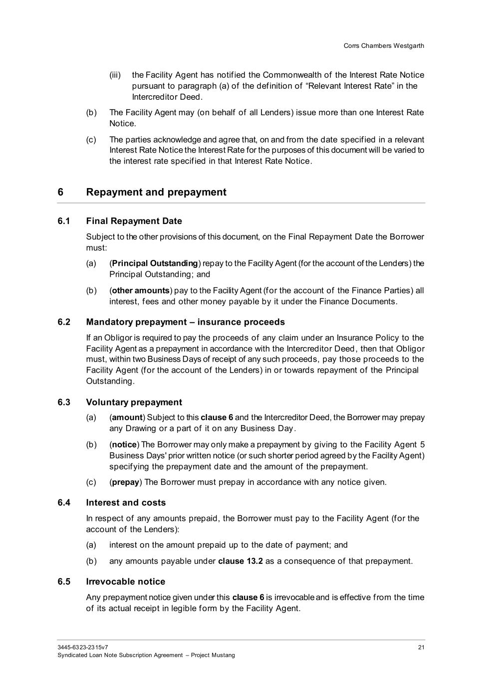 Corrs Chambers Westgarth 3445-6323-2315v7 21 Syndicated Loan Note Subscription Agreement – Project Mustang (iii) the Facility Agent has notif ied the Commonwealth of the Interest Rate Notice pursuant to paragraph (a) of the def inition of “Relevant Interest Rate” in the Intercreditor Deed. (b) The Facility Agent may (on behalf of all Lenders) issue more than one Interest Rate Notice. (c) The parties acknowledge and agree that, on and from the date specif ied in a relevant Interest Rate Notice the Interest Rate for the purposes of this document will be varied to the interest rate specif ied in that Interest Rate Notice. 6 Repayment and prepayment 6.1 Final Repayment Date Subject to the other provisions of this document, on the Final Repayment Date the Borrower must: (a) (Principal Outstanding) repay to the Facility Agent (for the account of the Lenders) the Principal Outstanding; and (b) (other amounts) pay to the Facility Agent (for the account of the Finance Parties) all interest, fees and other money payable by it under the Finance Documents. 6.2 Mandatory prepayment – insurance proceeds If an Obligor is required to pay the proceeds of any claim under an Insurance Policy to the Facility Agent as a prepayment in accordance with the Intercreditor Deed, then that Obligor must, within two Business Days of receipt of any such proceeds, pay those proceeds to the Facility Agent (for the account of the Lenders) in or towards repayment of the Principal Outstanding. 6.3 Voluntary prepayment (a) (amount) Subject to this clause 6 and the Intercreditor Deed, the Borrower may prepay any Drawing or a part of it on any Business Day. (b) (notice) The Borrower may only make a prepayment by giving to the Facility Agent 5 Business Days' prior written notice (or such shorter period agreed by the Facility Agent) specifying the prepayment date and the amount of the prepayment. (c) (prepay) The Borrower must prepay in accordance with any notice given. 6.4 Interest and costs In respect of any amounts prepaid, the Borrower must pay to the Facility Agent (for the account of the Lenders): (a) interest on the amount prepaid up to the date of payment; and (b) any amounts payable under clause 13.2 as a consequence of that prepayment. 6.5 Irrevocable notice Any prepayment notice given under this clause 6 is irrevocable and is effective f rom the time of its actual receipt in legible form by the Facility Agent.