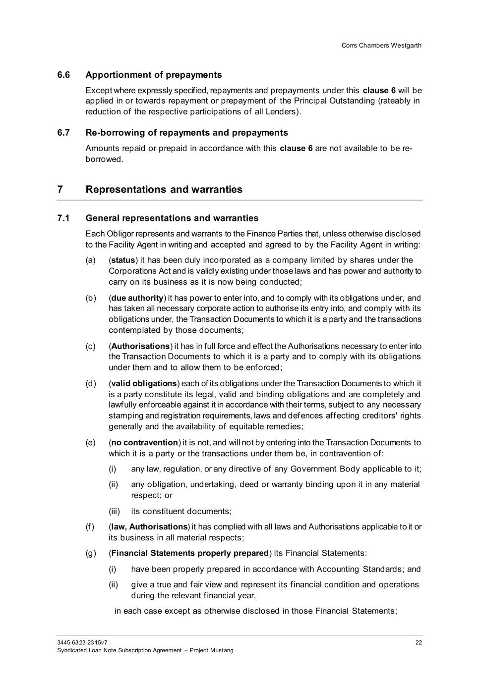 Corrs Chambers Westgarth 3445-6323-2315v7 22 Syndicated Loan Note Subscription Agreement – Project Mustang 6.6 Apportionment of prepayments Except where expressly specified, repayments and prepayments under this clause 6 will be applied in or towards repayment or prepayment of the Principal Outstanding (rateably in reduction of the respective participations of all Lenders). 6.7 Re-borrowing of repayments and prepayments Amounts repaid or prepaid in accordance with this clause 6 are not available to be re- borrowed. 7 Representations and warranties 7.1 General representations and warranties Each Obligor represents and warrants to the Finance Parties that, unless otherwise disclosed to the Facility Agent in writing and accepted and agreed to by the Facility Agent in writing: (a) (status) it has been duly incorporated as a company limited by shares under the Corporations Act and is validly existing under those laws and has power and authority to carry on its business as it is now being conducted; (b) (due authority) it has power to enter into, and to comply with its obligations under, and has taken all necessary corporate action to authorise its entry into, and comply with its obligations under, the Transaction Documents to which it is a party and the transactions contemplated by those documents; (c) (Authorisations) it has in full force and effect the Authorisations necessary to enter into the Transaction Documents to which it is a party and to comply with its obligations under them and to allow them to be enforced; (d) (valid obligations) each of its obligations under the Transaction Documents to which it is a party constitute its legal, valid and binding obligations and are completely and lawfully enforceable against it in accordance with their terms, subject to any necessary stamping and registration requirements, laws and defences af fecting creditors' rights generally and the availability of equitable remedies; (e) (no contravention) it is not, and will not by entering into the Transaction Documents to which it is a party or the transactions under them be, in contravention of : (i) any law, regulation, or any directive of any Government Body applicable to it; (ii) any obligation, undertaking, deed or warranty binding upon it in any material respect; or (iii) its constituent documents; (f ) (law, Authorisations) it has complied with all laws and Authorisations applicable to it or its business in all material respects; (g) (Financial Statements properly prepared) its Financial Statements: (i) have been properly prepared in accordance with Accounting Standards; and (ii) give a true and fair view and represent its f inancial condition and operations during the relevant f inancial year, in each case except as otherwise disclosed in those Financial Statements;