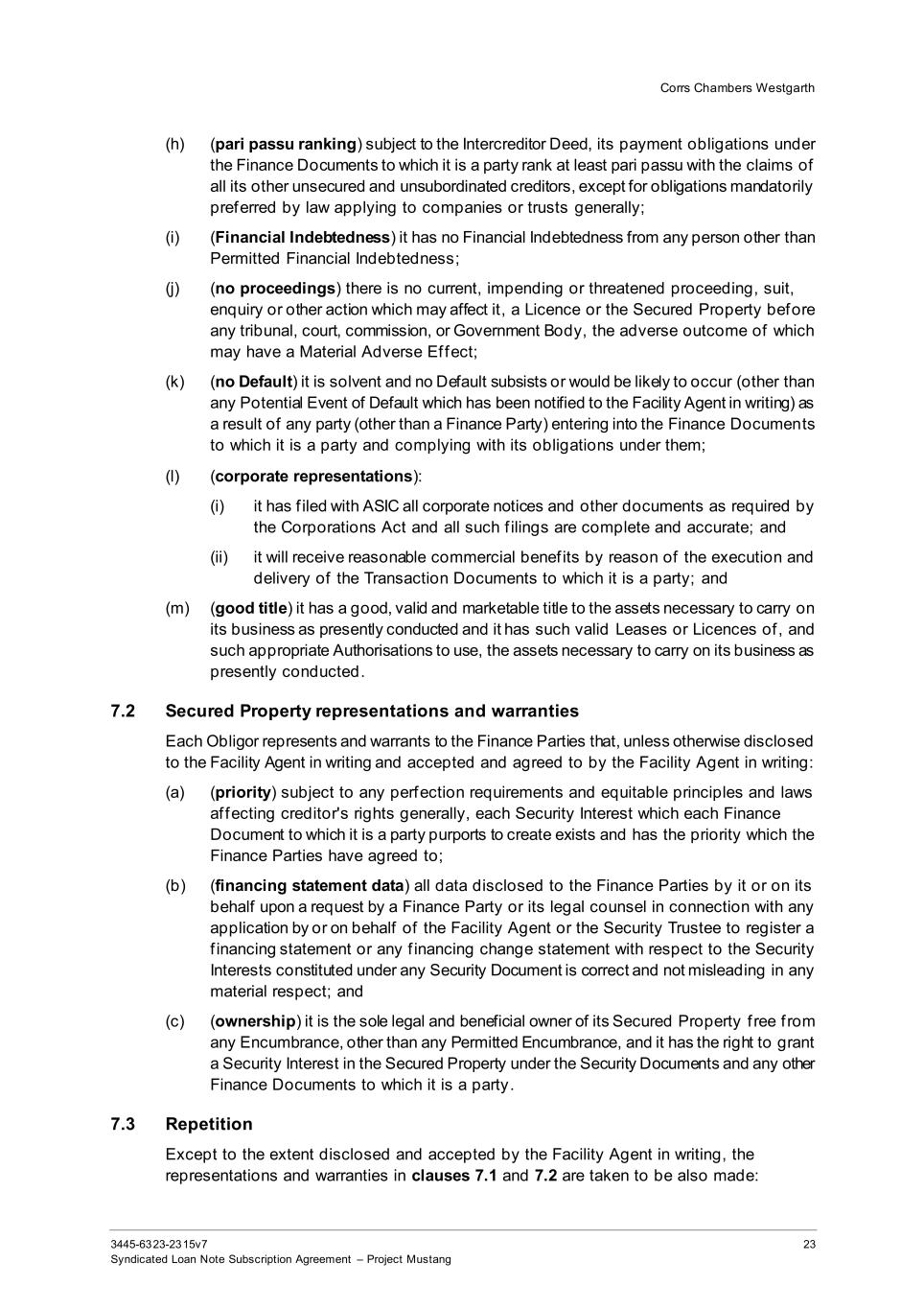 Corrs Chambers Westgarth 3445-6323-2315v7 23 Syndicated Loan Note Subscription Agreement – Project Mustang (h) (pari passu ranking) subject to the Intercreditor Deed, its payment obligations under the Finance Documents to which it is a party rank at least pari passu with the claims of all its other unsecured and unsubordinated creditors, except for obligations mandatorily preferred by law applying to companies or trusts generally; (i) (Financial Indebtedness) it has no Financial Indebtedness from any person other than Permitted Financial Indebtedness; (j) (no proceedings) there is no current, impending or threatened proceeding, suit, enquiry or other action which may affect it, a Licence or the Secured Property before any tribunal, court, commission, or Government Body, the adverse outcome of which may have a Material Adverse Ef fect; (k) (no Default) it is solvent and no Default subsists or would be likely to occur (other than any Potential Event of Default which has been notified to the Facility Agent in writing) as a result of any party (other than a Finance Party) entering into the Finance Documents to which it is a party and complying with its obligations under them; (l) (corporate representations): (i) it has f iled with ASIC all corporate notices and other documents as required by the Corporations Act and all such f ilings are complete and accurate; and (ii) it will receive reasonable commercial benef its by reason of the execution and delivery of the Transaction Documents to which it is a party; and (m) (good title) it has a good, valid and marketable title to the assets necessary to carry on its business as presently conducted and it has such valid Leases or Licences of , and such appropriate Authorisations to use, the assets necessary to carry on its business as presently conducted. 7.2 Secured Property representations and warranties Each Obligor represents and warrants to the Finance Parties that, unless otherwise disclosed to the Facility Agent in writing and accepted and agreed to by the Facility Agent in writing: (a) (priority) subject to any perfection requirements and equitable principles and laws af fecting creditor's rights generally, each Security Interest which each Finance Document to which it is a party purports to create exists and has the priority which the Finance Parties have agreed to; (b) (financing statement data) all data disclosed to the Finance Parties by it or on its behalf upon a request by a Finance Party or its legal counsel in connection with any application by or on behalf of the Facility Agent or the Security Trustee to register a f inancing statement or any f inancing change statement with respect to the Security Interests constituted under any Security Document is correct and not misleading in any material respect; and (c) (ownership) it is the sole legal and beneficial owner of its Secured Property f ree f rom any Encumbrance, other than any Permitted Encumbrance, and it has the right to grant a Security Interest in the Secured Property under the Security Documents and any other Finance Documents to which it is a party. 7.3 Repetition Except to the extent disclosed and accepted by the Facility Agent in writing, the representations and warranties in clauses 7.1 and 7.2 are taken to be also made: