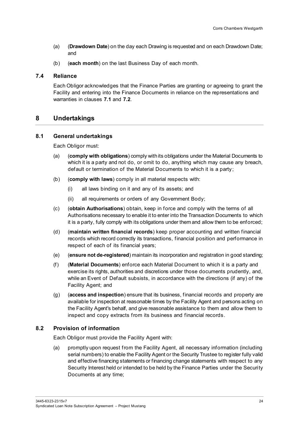 Corrs Chambers Westgarth 3445-6323-2315v7 24 Syndicated Loan Note Subscription Agreement – Project Mustang (a) (Drawdown Date) on the day each Drawing is requested and on each Drawdown Date; and (b) (each month) on the last Business Day of each month. 7.4 Reliance Each Obligor acknowledges that the Finance Parties are granting or agreeing to grant the Facility and entering into the Finance Documents in reliance on the representations and warranties in clauses 7.1 and 7.2. 8 Undertakings 8.1 General undertakings Each Obligor must: (a) (comply with obligations) comply with its obligations under the Material Documents to which it is a party and not do, or omit to do, anything which may cause any breach, default or termination of the Material Documents to which it is a party ; (b) (comply with laws) comply in all material respects with: (i) all laws binding on it and any of its assets; and (ii) all requirements or orders of any Government Body; (c) (obtain Authorisations) obtain, keep in force and comply with the terms of all Authorisations necessary to enable it to enter into the Transaction Documents to which it is a party, fully comply with its obligations under them and allow them to be enforced; (d) (maintain written financial records) keep proper accounting and written f inancial records which record correctly its transactions, f inancial position and performance in respect of each of its f inancial years; (e) (ensure not de-registered) maintain its incorporation and registration in good standing; (f ) (Material Documents) enforce each Material Document to which it is a party and exercise its rights, authorities and discretions under those documents prudently, and, while an Event of Default subsists, in accordance with the directions (if any) of the Facility Agent; and (g) (access and inspection) ensure that its business, f inancial records and property are available for inspection at reasonable times by the Facility Agent and persons acting on the Facility Agent's behalf, and give reasonable assistance to them and allow them to inspect and copy extracts f rom its business and f inancial records. 8.2 Provision of information Each Obligor must provide the Facility Agent with: (a) promptly upon request f rom the Facility Agent, all necessary information (including serial numbers) to enable the Facility Agent or the Security Trustee to register fully valid and ef fective financing statements or f inancing change statements with respect to any Security Interest held or intended to be held by the Finance Parties under the Securi ty Documents at any time;