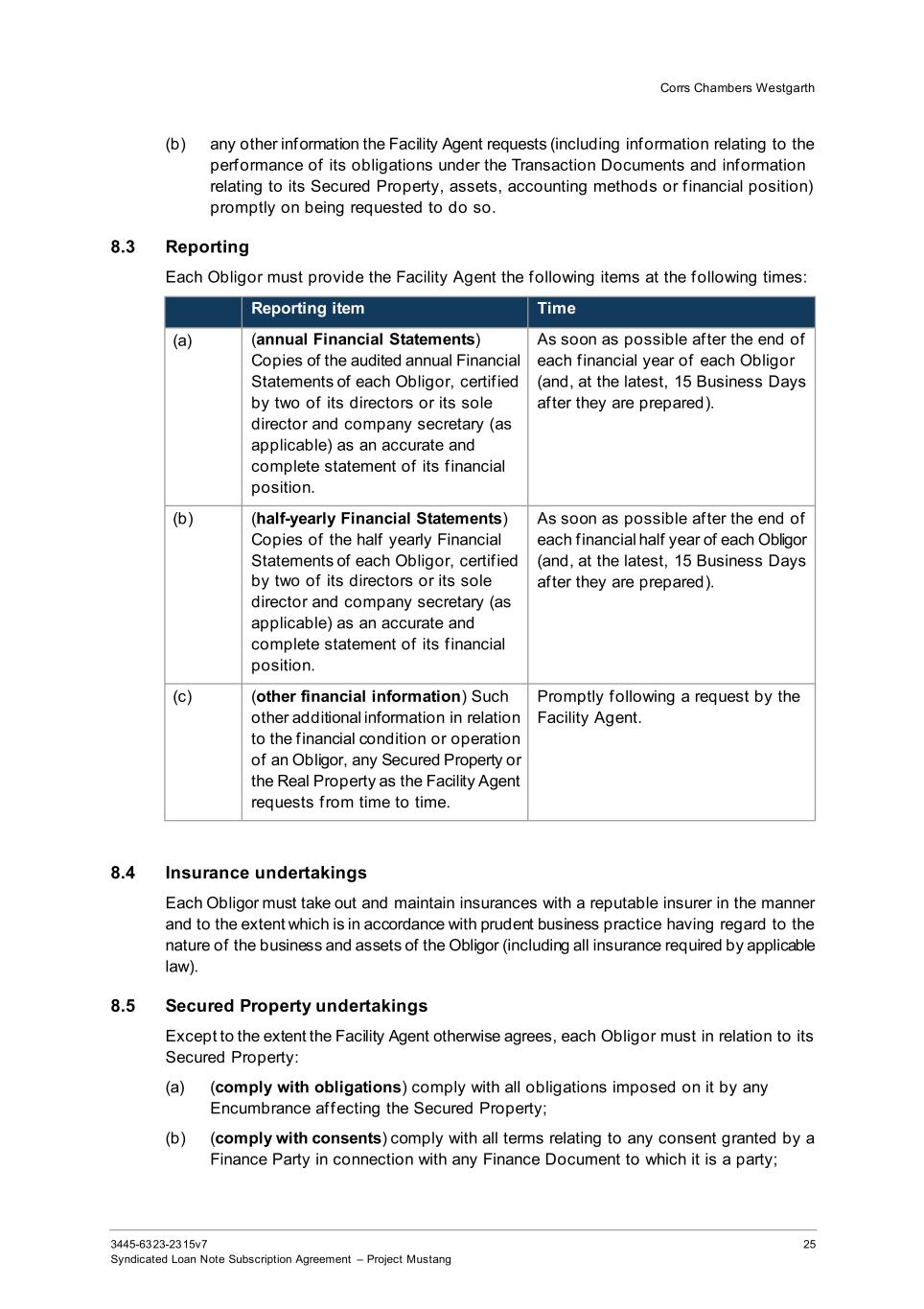Corrs Chambers Westgarth 3445-6323-2315v7 25 Syndicated Loan Note Subscription Agreement – Project Mustang (b) any other information the Facility Agent requests (including information relating to the performance of its obligations under the Transaction Documents and information relating to its Secured Property, assets, accounting methods or f inancial position) promptly on being requested to do so. 8.3 Reporting Each Obligor must provide the Facility Agent the following items at the following times: Reporting item Time (a) (annual Financial Statements) Copies of the audited annual Financial Statements of each Obligor, certif ied by two of its directors or its sole director and company secretary (as applicable) as an accurate and complete statement of its f inancial position. As soon as possible af ter the end of each f inancial year of each Obligor (and, at the latest, 15 Business Days af ter they are prepared). (b) (half-yearly Financial Statements) Copies of the half yearly Financial Statements of each Obligor, certif ied by two of its directors or its sole director and company secretary (as applicable) as an accurate and complete statement of its f inancial position. As soon as possible af ter the end of each f inancial half year of each Obligor (and, at the latest, 15 Business Days af ter they are prepared). (c) (other financial information) Such other additional information in relation to the f inancial condition or operation of an Obligor, any Secured Property or the Real Property as the Facility Agent requests f rom time to time. Promptly following a request by the Facility Agent. 8.4 Insurance undertakings Each Obligor must take out and maintain insurances with a reputable insurer in the manner and to the extent which is in accordance with prudent business practice having regard to the nature of the business and assets of the Obligor (including all insurance required by applicable law). 8.5 Secured Property undertakings Except to the extent the Facility Agent otherwise agrees, each Obligor must in relation to its Secured Property: (a) (comply with obligations) comply with all obligations imposed on it by any Encumbrance af fecting the Secured Property; (b) (comply with consents) comply with all terms relating to any consent granted by a Finance Party in connection with any Finance Document to which it is a party;
