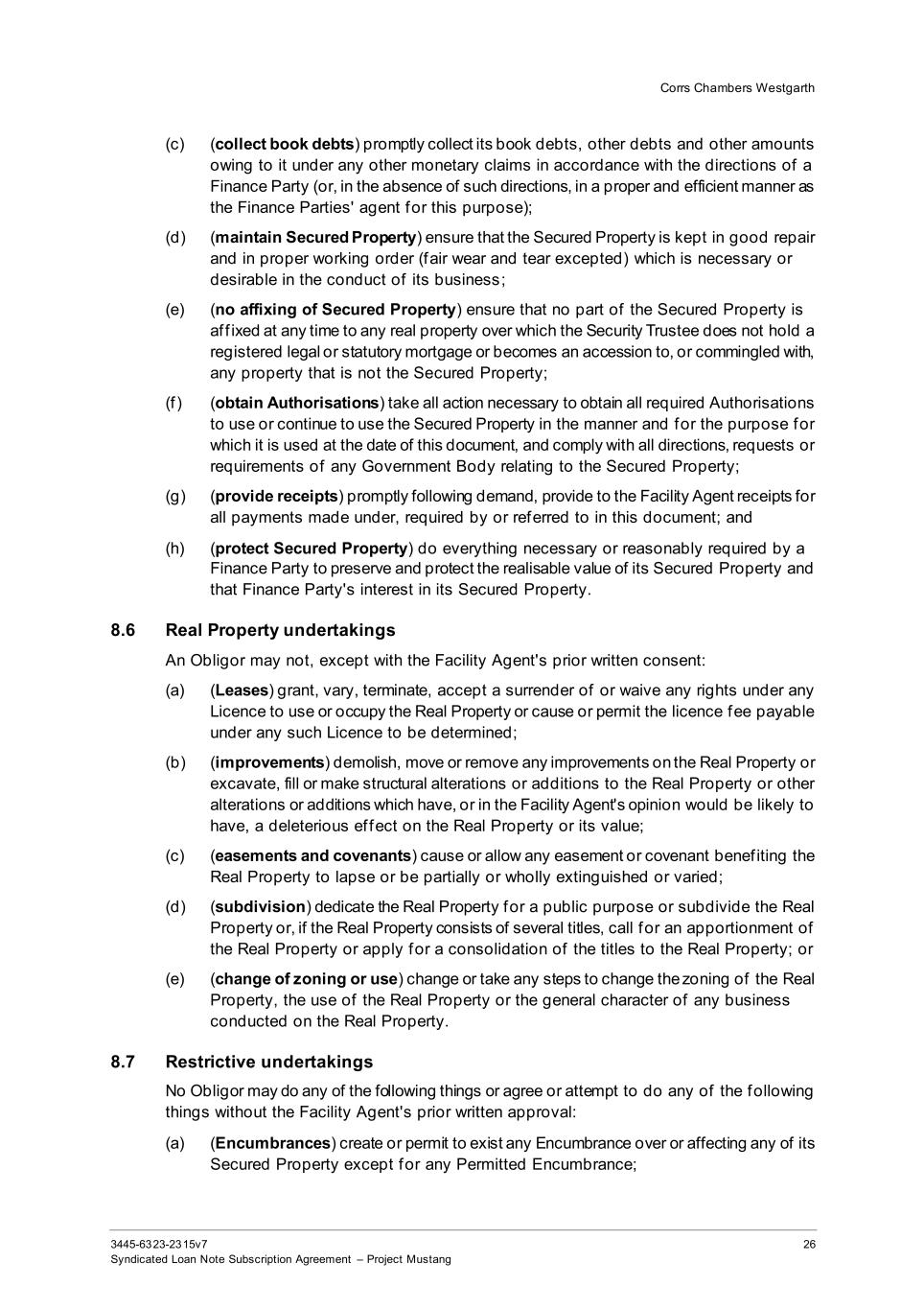 Corrs Chambers Westgarth 3445-6323-2315v7 26 Syndicated Loan Note Subscription Agreement – Project Mustang (c) (collect book debts) promptly collect its book debts, other debts and other amounts owing to it under any other monetary claims in accordance with the directions of a Finance Party (or, in the absence of such directions, in a proper and efficient manner as the Finance Parties' agent for this purpose); (d) (maintain Secured Property) ensure that the Secured Property is kept in good repair and in proper working order (fair wear and tear excepted) which is necessary or desirable in the conduct of its business; (e) (no affixing of Secured Property) ensure that no part of the Secured Property is af f ixed at any time to any real property over which the Security Trustee does not hold a registered legal or statutory mortgage or becomes an accession to, or commingled with, any property that is not the Secured Property; (f ) (obtain Authorisations) take all action necessary to obtain all required Authorisations to use or continue to use the Secured Property in the manner and for the purpose for which it is used at the date of this document, and comply with all directions, requests or requirements of any Government Body relating to the Secured Property; (g) (provide receipts) promptly following demand, provide to the Facility Agent receipts for all payments made under, required by or referred to in this document; and (h) (protect Secured Property) do everything necessary or reasonably required by a Finance Party to preserve and protect the realisable value of its Secured Property and that Finance Party's interest in its Secured Property. 8.6 Real Property undertakings An Obligor may not, except with the Facility Agent's prior written consent: (a) (Leases) grant, vary, terminate, accept a surrender of or waive any rights under any Licence to use or occupy the Real Property or cause or permit the licence fee payable under any such Licence to be determined; (b) (improvements) demolish, move or remove any improvements on the Real Property or excavate, fill or make structural alterations or additions to the Real Property or other alterations or additions which have, or in the Facility Agent's opinion would be likely to have, a deleterious ef fect on the Real Property or its value; (c) (easements and covenants) cause or allow any easement or covenant benef iting the Real Property to lapse or be partially or wholly extinguished or varied; (d) (subdivision) dedicate the Real Property for a public purpose or subdivide the Real Property or, if the Real Property consists of several titles, call for an apportionment of the Real Property or apply for a consolidation of the titles to the Real Property; or (e) (change of zoning or use) change or take any steps to change the zoning of the Real Property, the use of the Real Property or the general character of any business conducted on the Real Property. 8.7 Restrictive undertakings No Obligor may do any of the following things or agree or attempt to do any of the following things without the Facility Agent's prior written approval: (a) (Encumbrances) create or permit to exist any Encumbrance over or affecting any of its Secured Property except for any Permitted Encumbrance;