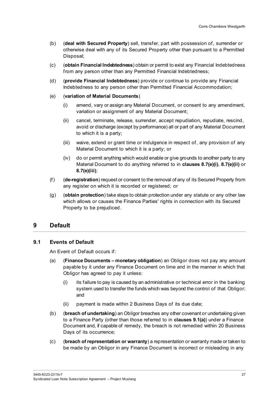 Corrs Chambers Westgarth 3445-6323-2315v7 27 Syndicated Loan Note Subscription Agreement – Project Mustang (b) (deal with Secured Property) sell, transfer, part with possession of , surrender or otherwise deal with any of its Secured Property other than pursuant to a Permitted Disposal; (c) (obtain Financial Indebtedness) obtain or permit to exist any Financial Indebtedness f rom any person other than any Permitted Financial Indebtedness; (d) (provide Financial Indebtedness) provide or continue to provide any Financial Indebtedness to any person other than Permitted Financial Accommodation; (e) (variation of Material Documents) (i) amend, vary or assign any Material Document, or consent to any amendment, variation or assignment of any Material Document; (ii) cancel, terminate, release, surrender, accept repudiation, repudiate, rescind, avoid or discharge (except by performance) all or part of any Material Document to which it is a party; (iii) waive, extend or grant time or indulgence in respect of , any provision of any Material Document to which it is a party; or (iv) do or permit anything which would enable or give grounds to another party to any Material Document to do anything referred to in clauses 8.7(e)(i), 8.7(e)(ii) or 8.7(e)(iii); (f ) (de-registration) request or consent to the removal of any of its Secured Property from any register on which it is recorded or registered; or (g) (obtain protection) take steps to obtain protection under any statute or any other law which allows or causes the Finance Parties' rights in connection with its Secured Property to be prejudiced. 9 Default 9.1 Events of Default An Event of Default occurs if : (a) (Finance Documents – monetary obligation) an Obligor does not pay any amount payable by it under any Finance Document on time and in the manner in which that Obligor has agreed to pay it unless: (i) its failure to pay is caused by an administrative or technical error in the banking system used to transfer the funds which was beyond the control of that Obligor; and (ii) payment is made within 2 Business Days of its due date; (b) (breach of undertaking) an Obligor breaches any other covenant or undertaking given to a Finance Party (other than those referred to in clauses 9.1(a)) under a Finance Document and, if capable of remedy, the breach is not remedied within 20 Business Days of its occurrence; (c) (breach of representation or warranty) a representation or warranty made or taken to be made by an Obligor in any Finance Document is incorrect or misleading in any