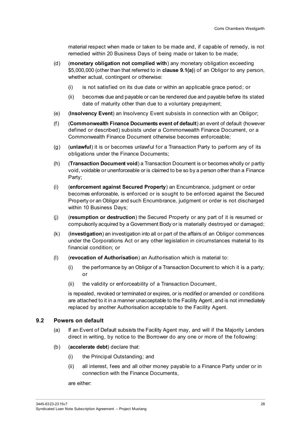 Corrs Chambers Westgarth 3445-6323-2315v7 28 Syndicated Loan Note Subscription Agreement – Project Mustang material respect when made or taken to be made and, if capable of remedy, is not remedied within 20 Business Days of being made or taken to be made; (d) (monetary obligation not complied with) any monetary obligation exceeding $5,000,000 (other than that referred to in clause 9.1(a)) of an Obligor to any person, whether actual, contingent or otherwise: (i) is not satisf ied on its due date or within an applicable grace period; or (ii) becomes due and payable or can be rendered due and payable before its stated date of maturity other than due to a voluntary prepayment; (e) (Insolvency Event) an Insolvency Event subsists in connection with an Obligor; (f ) (Commonwealth Finance Documents event of default) an event of default (however def ined or described) subsists under a Commonwealth Finance Document, or a Commonwealth Finance Document otherwise becomes enforceable; (g) (unlawful) it is or becomes unlawful for a Transaction Party to perform any of its obligations under the Finance Documents; (h) (Transaction Document void) a Transaction Document is or becomes wholly or partly void, voidable or unenforceable or is claimed to be so by a person other than a Finance Party; (i) (enforcement against Secured Property) an Encumbrance, judgment or order becomes enforceable, is enforced or is sought to be enforced against the Secured Property or an Obligor and such Encumbrance, judgment or order is not discharged within 10 Business Days; (j) (resumption or destruction) the Secured Property or any part of it is resumed or compulsorily acquired by a Government Body or is materially destroyed or damaged; (k) (investigation) an investigation into all or part of the affairs of an Obligor commences under the Corporations Act or any other legislation in circumstances material to its f inancial condition; or (l) (revocation of Authorisation) an Authorisation which is material to: (i) the performance by an Obligor of a Transaction Document to which it is a party; or (ii) the validity or enforceability of a Transaction Document, is repealed, revoked or terminated or expires, or is modified or amended or conditions are attached to it in a manner unacceptable to the Facility Agent, and is not immediately replaced by another Authorisation acceptable to the Facility Agent. 9.2 Powers on default (a) If an Event of Default subsists the Facility Agent may, and will if the Majority Lenders direct in writing, by notice to the Borrower do any one or more of the following: (b) (accelerate debt) declare that: (i) the Principal Outstanding; and (ii) all interest, fees and all other money payable to a Finance Party under or in connection with the Finance Documents, are either: