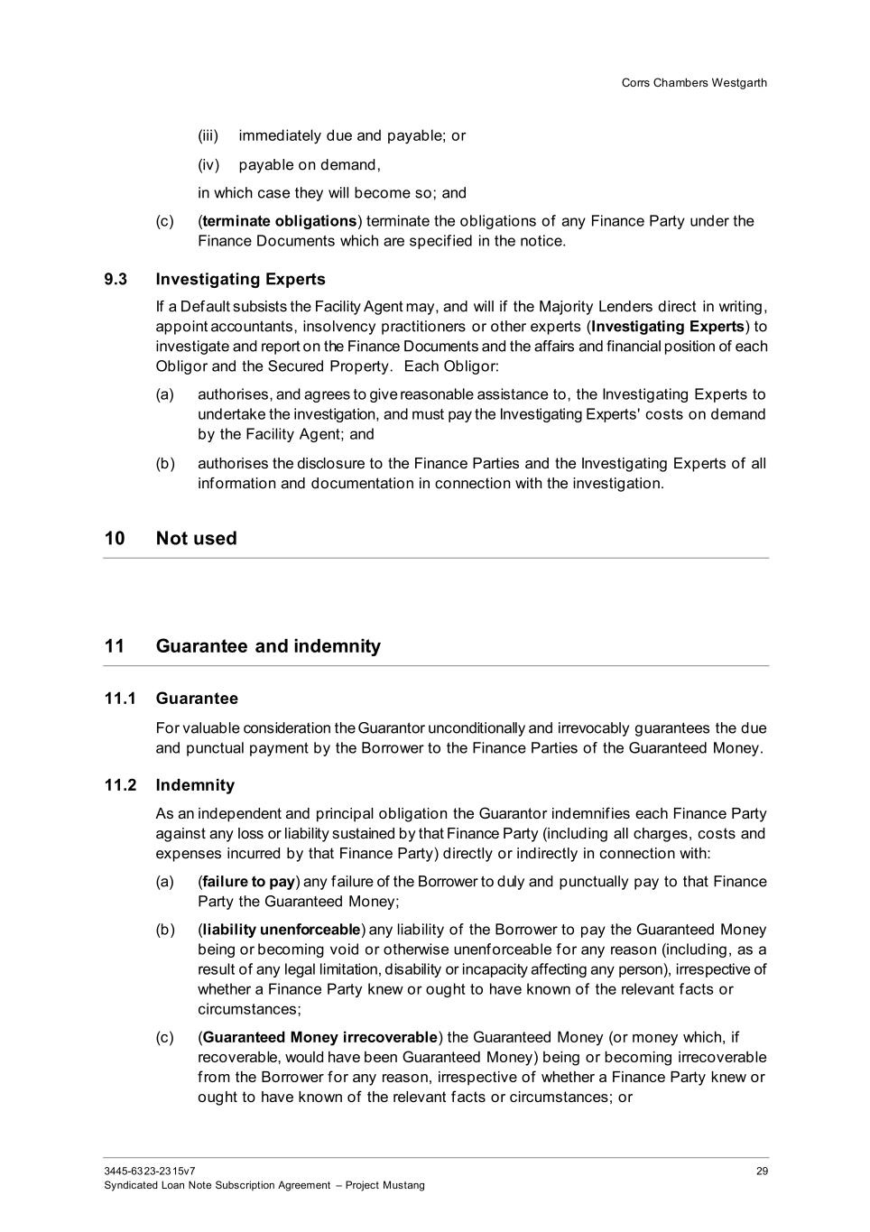 Corrs Chambers Westgarth 3445-6323-2315v7 29 Syndicated Loan Note Subscription Agreement – Project Mustang (iii) immediately due and payable; or (iv) payable on demand, in which case they will become so; and (c) (terminate obligations) terminate the obligations of any Finance Party under the Finance Documents which are specif ied in the notice. 9.3 Investigating Experts If a Default subsists the Facility Agent may, and will if the Majority Lenders direct in writing, appoint accountants, insolvency practitioners or other experts (Investigating Experts) to investigate and report on the Finance Documents and the affairs and financial position of each Obligor and the Secured Property. Each Obligor: (a) authorises, and agrees to give reasonable assistance to, the Investigating Experts to undertake the investigation, and must pay the Investigating Experts' costs on demand by the Facility Agent; and (b) authorises the disclosure to the Finance Parties and the Investigating Experts of all information and documentation in connection with the investigation. 10 Not used 11 Guarantee and indemnity 11.1 Guarantee For valuable consideration the Guarantor unconditionally and irrevocably guarantees the due and punctual payment by the Borrower to the Finance Parties of the Guaranteed Money. 11.2 Indemnity As an independent and principal obligation the Guarantor indemnif ies each Finance Party against any loss or liability sustained by that Finance Party (including all charges, costs and expenses incurred by that Finance Party) directly or indirectly in connection with: (a) (failure to pay) any failure of the Borrower to duly and punctually pay to that Finance Party the Guaranteed Money; (b) (liability unenforceable) any liability of the Borrower to pay the Guaranteed Money being or becoming void or otherwise unenforceable for any reason (including, as a result of any legal limitation, disability or incapacity affecting any person), irrespective of whether a Finance Party knew or ought to have known of the relevant facts or circumstances; (c) (Guaranteed Money irrecoverable) the Guaranteed Money (or money which, if recoverable, would have been Guaranteed Money) being or becoming irrecoverable f rom the Borrower for any reason, irrespective of whether a Finance Party knew or ought to have known of the relevant facts or circumstances; or